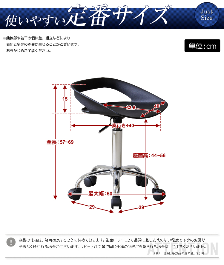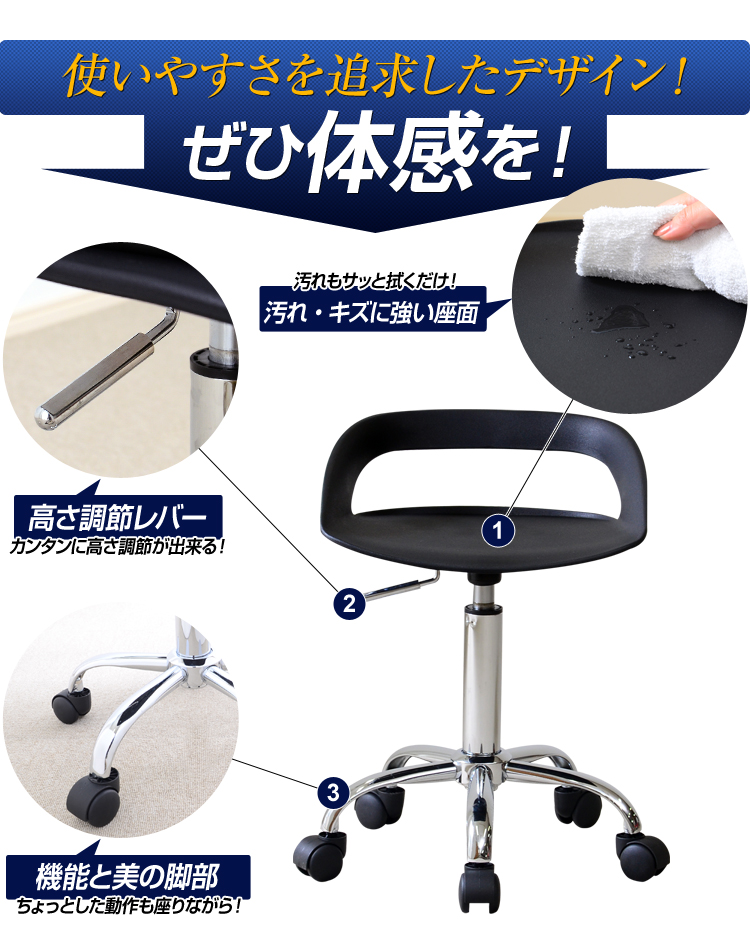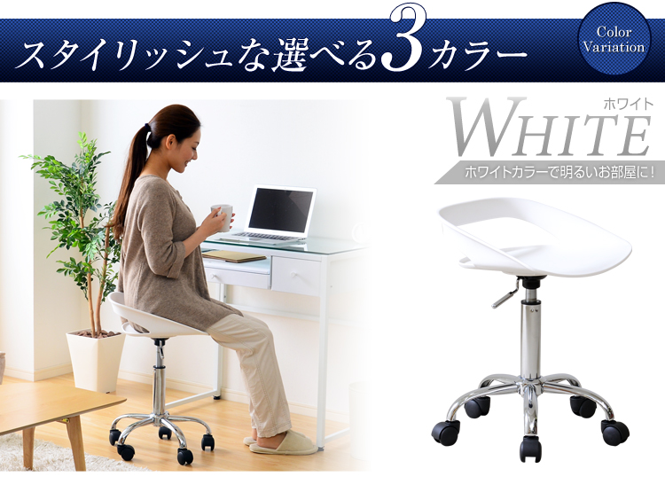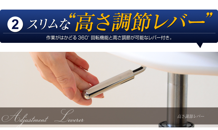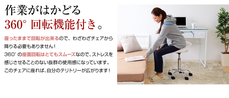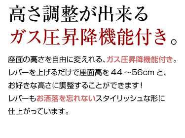座面高を44~56cmと、お好きな高さに調節できるガス圧機能昇降付きです。また、作業がはかどる360度回転機能もついてます。