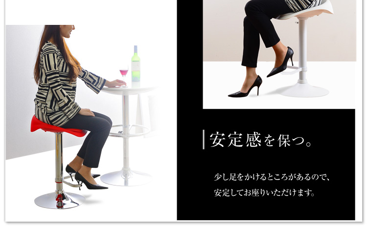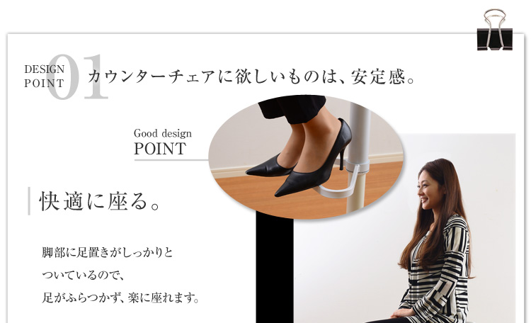 脚部に足置きが付いているので、足がふらつかず、楽に座れます。少し足をかけるところもあるので、安定してお座りいただけます。