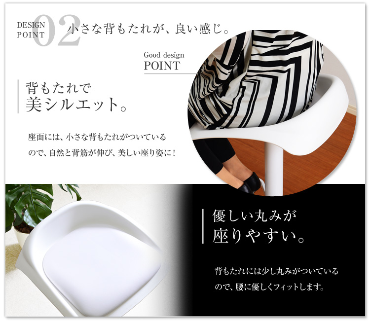 クッション付きの座面には少し丸みを帯びた背もたれがついているので、自然と背筋が伸び、美しい座り姿になります。