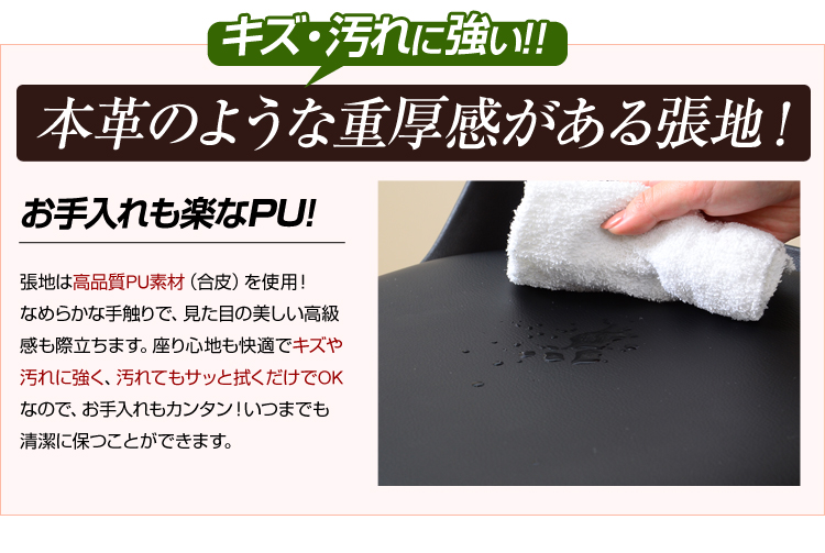 柔らかく、しっとりとした肌触りのPUソフトレザーを使用しているので、肌に吸いつく心地よさを感じられます。汚れにも強いのでお手入れも簡単です。