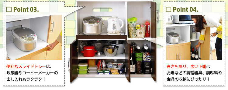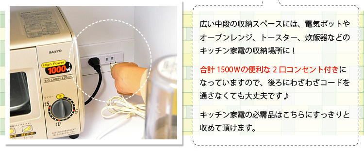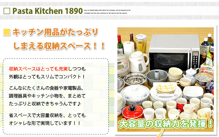 外観はコンパクトながら収納スペースは充実!たくさんの食器、家電、調理器具、キッチン小物をまとめて収納できます!