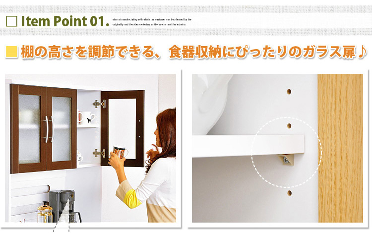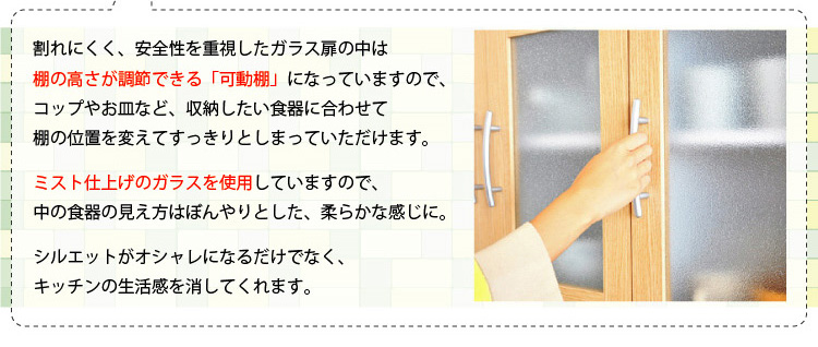 上段のガラス扉や、下段の扉の中には棚の高さが調節できる可動棚になっているので、収納物に合わせてスッキリしまっていただけます。
