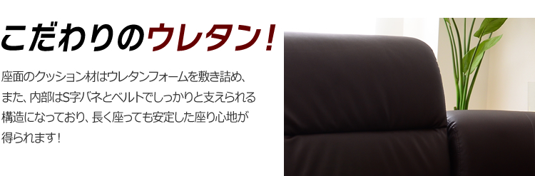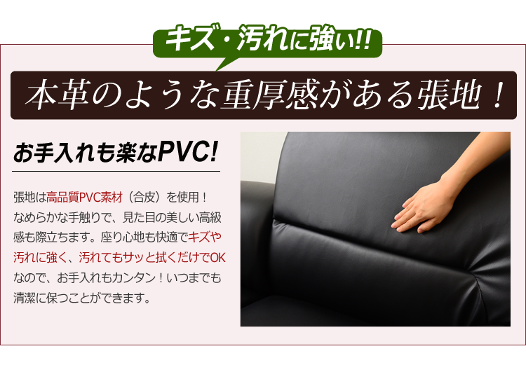長く座っても安定した座り心地が得られるよう、こだわりのウレタン素材を敷き詰め、張地は滑らかな手触りでお手入れも簡単な、高品質PVCを使用しています!