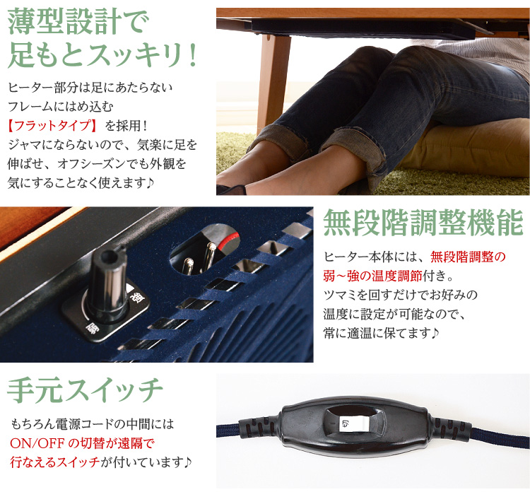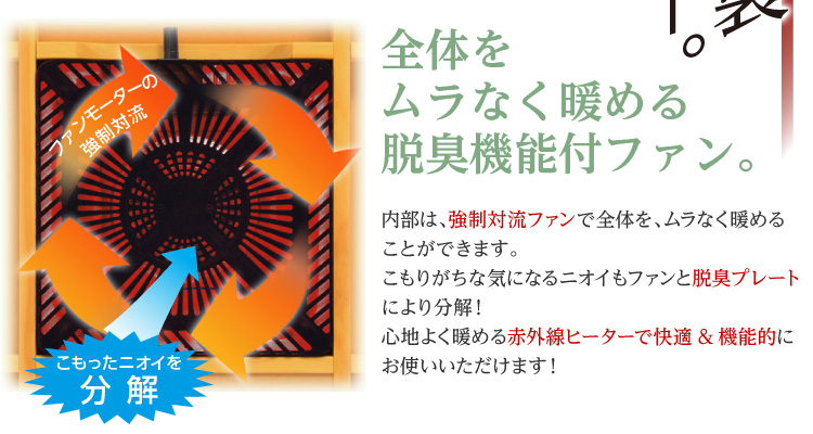 全体を暖める防臭機能付きファンと、心地よく暖める赤外線ヒーターで快適にお使いいただけます。フレームにはめ込むフラットタイプなので足を伸ばしても邪魔になりません!