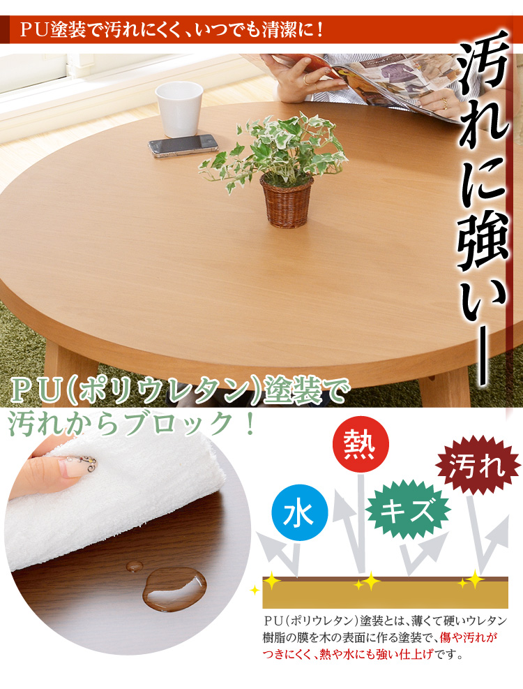 傷や汚れに強く、熱や水にも強いポリウレタン塗装を施しているので、いつでも清潔にお使いいただけます。