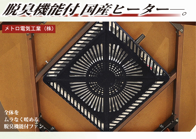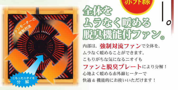 全体を暖める防臭機能付きファンと、心地よく暖める赤外線ヒーターで快適にお使いいただけます。フレームにはめ込むフラットタイプなので足を伸ばしても邪魔になりません!