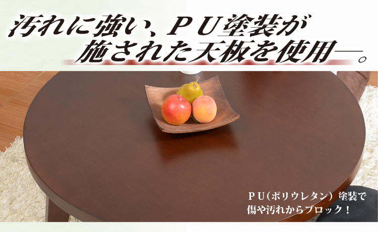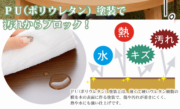 傷や汚れに強く、熱や水にも強いポリウレタン塗装を施しているので、いつでも清潔にお使いいただけます。