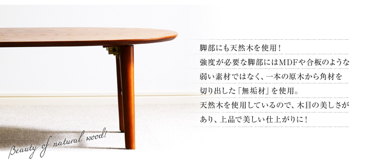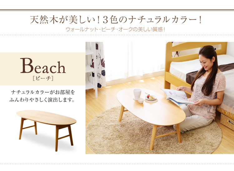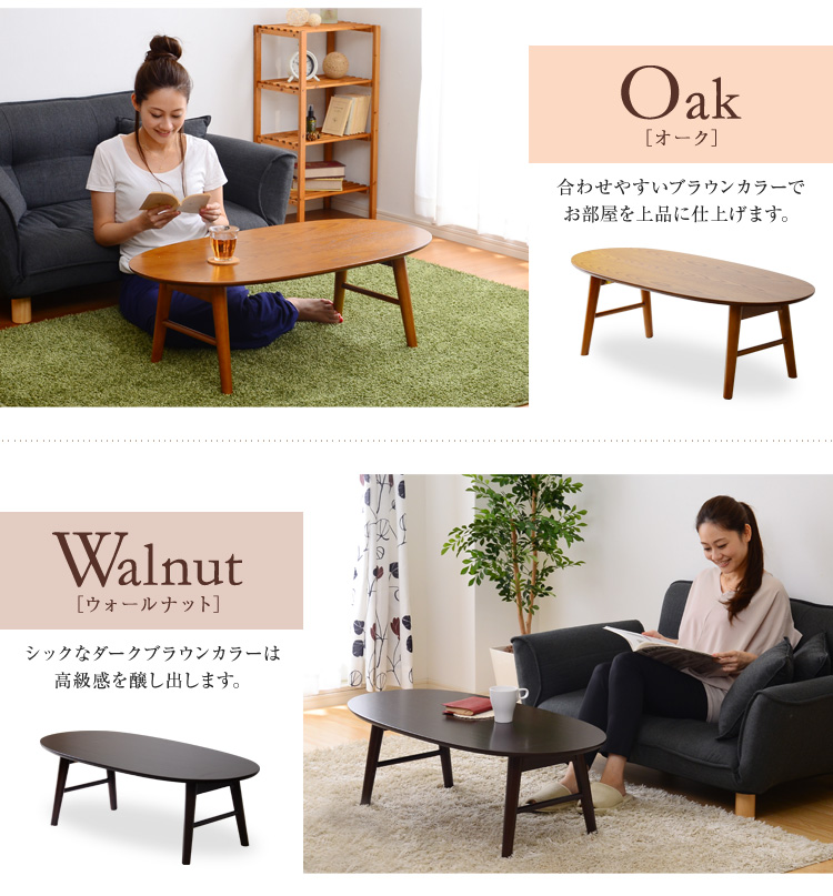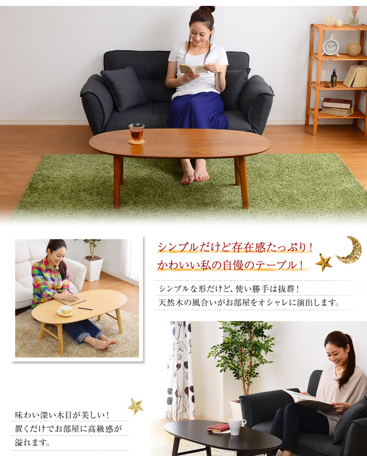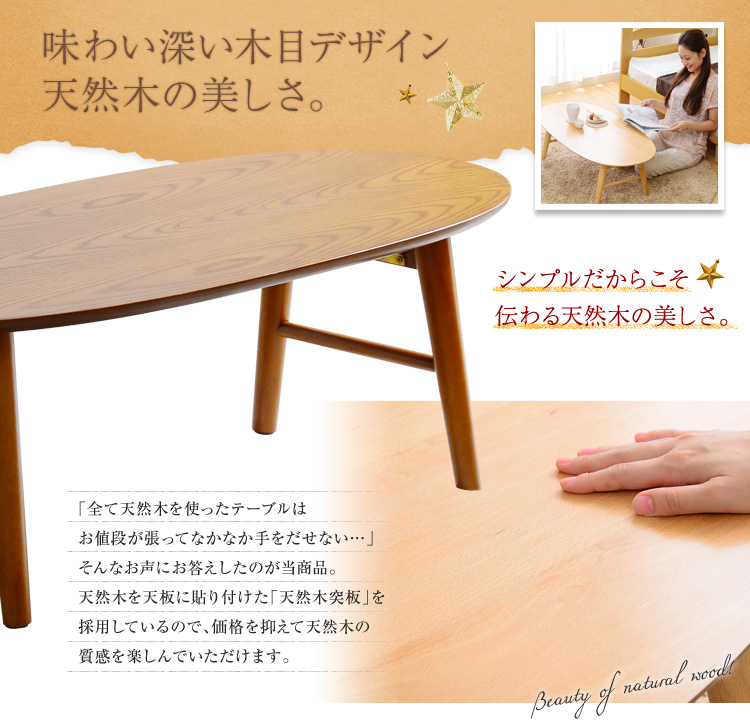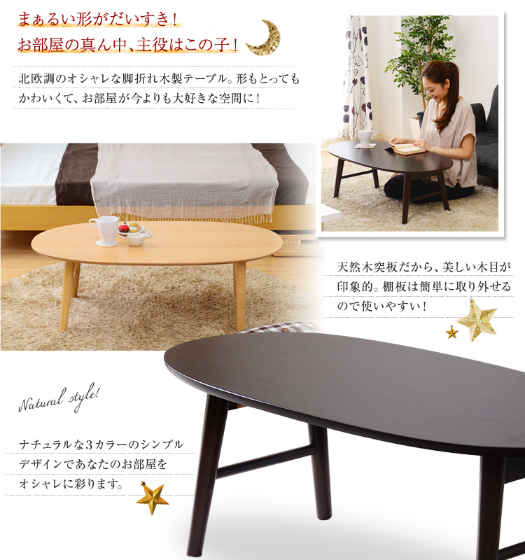 天然木突板の美しい木目が印象的な、北欧調のオシャレな脚折れテーブル。形もかわいくてお部屋に優しい印象を与えます。