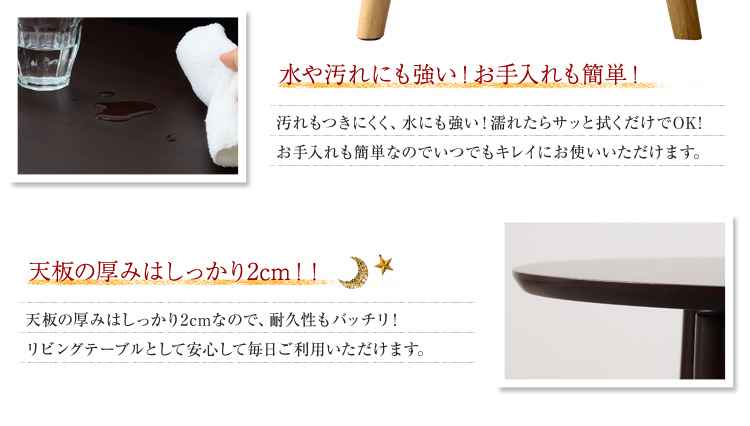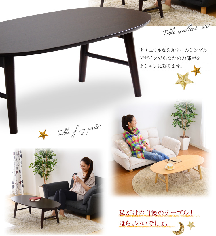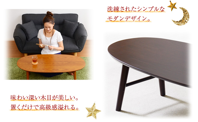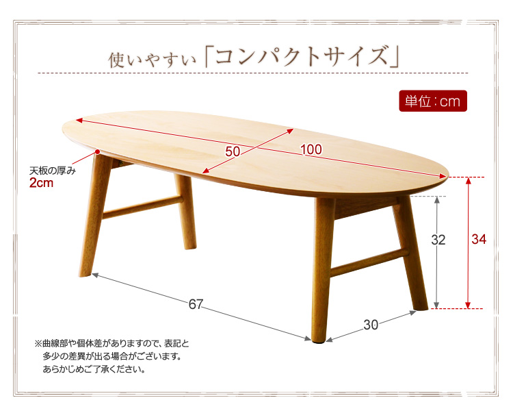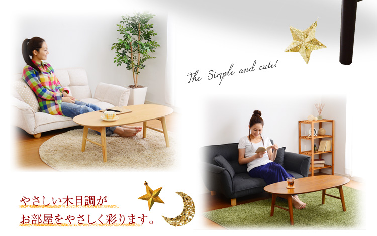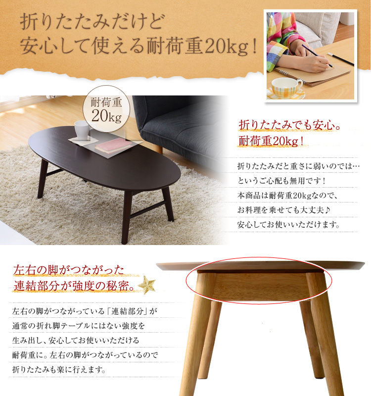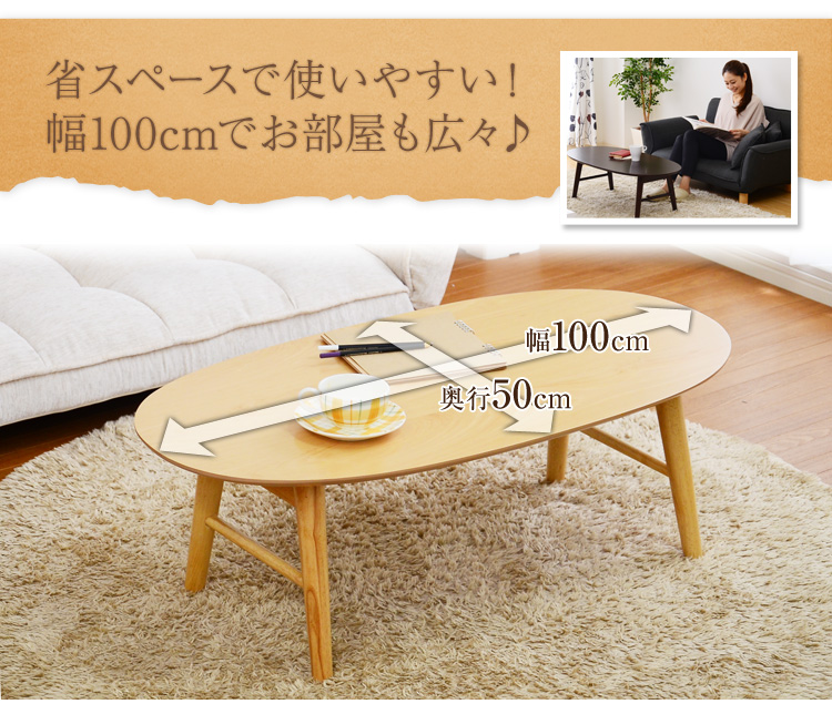 天然木突板の美しい木目が印象的な、北欧調のオシャレな脚折れテーブル。形もかわいくてお部屋に優しい印象を与えます。
