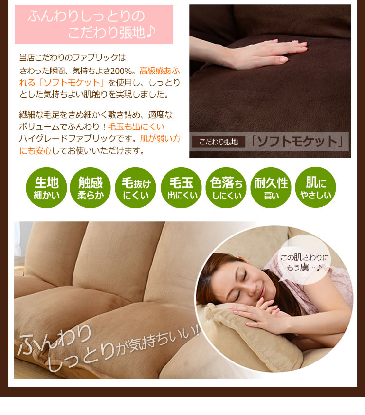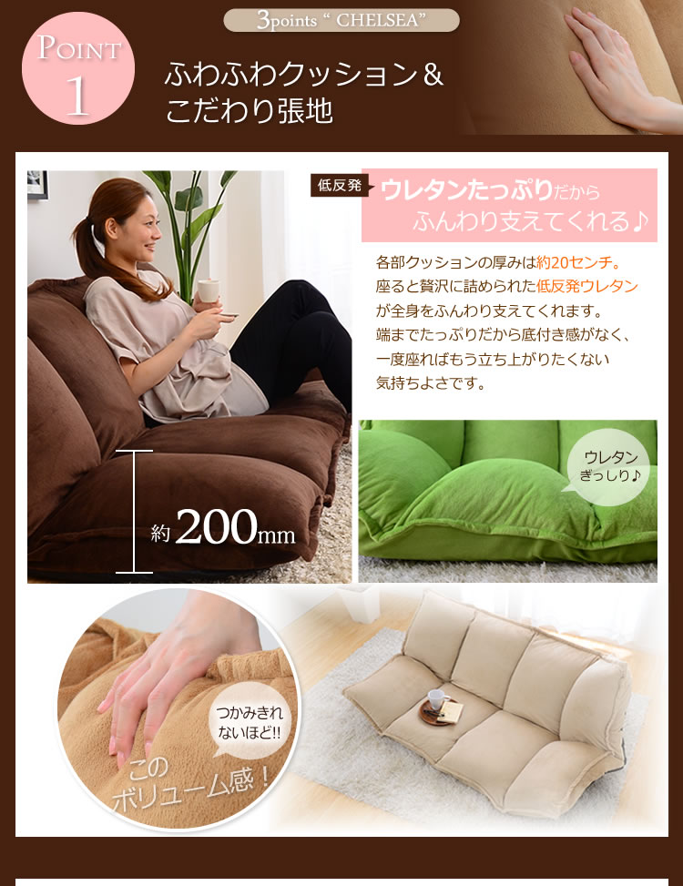 クッションの厚さは20cm!中には贅沢に敷き詰められた低反発ウレタンが入っているので底付き感がなくふんわり。生地には、しっとりとした気持ちよい肌触りのソフトモケットを使用しています!