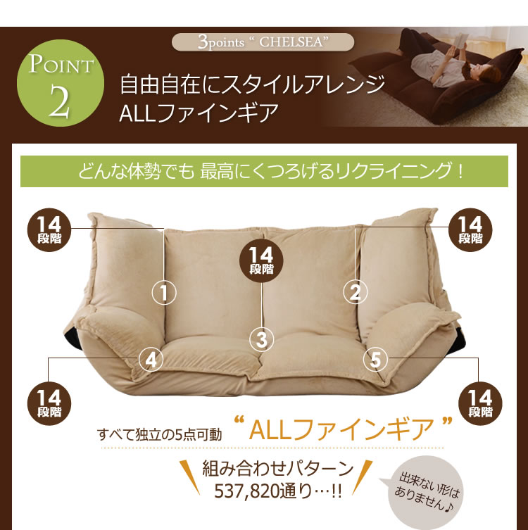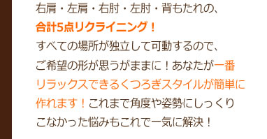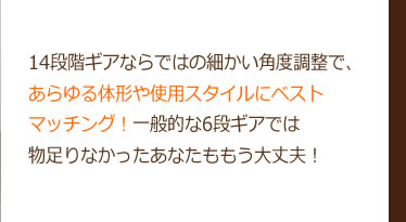 独立している5点の可動のギアは各14段階!細かい角度調整で、あらゆる体形や使用スタイルにする事ができます!