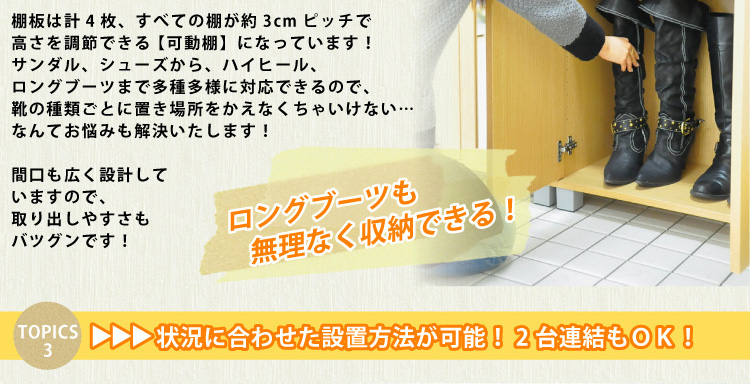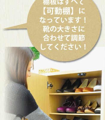 収納物に合わせて調節できるので、サンダルからロングブーツまで多種多様に対応できます。