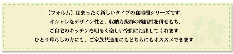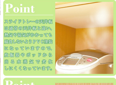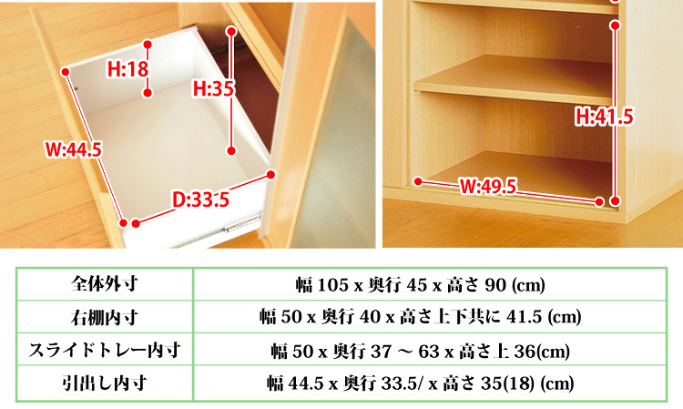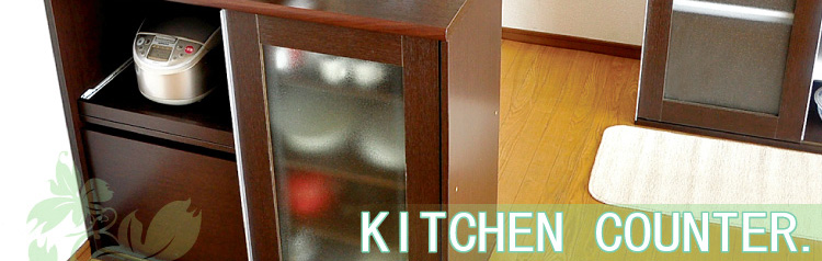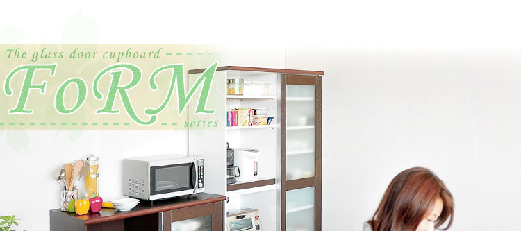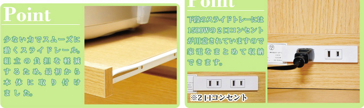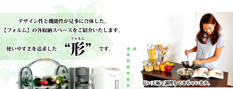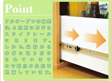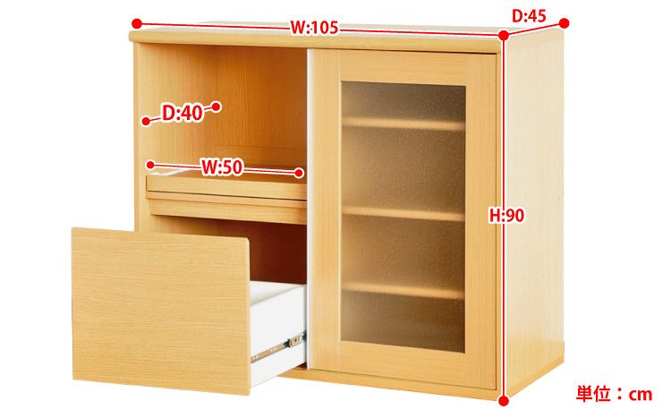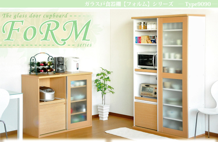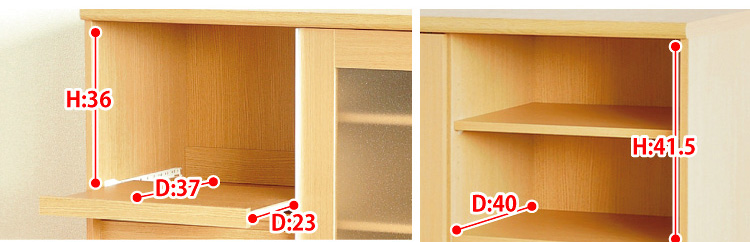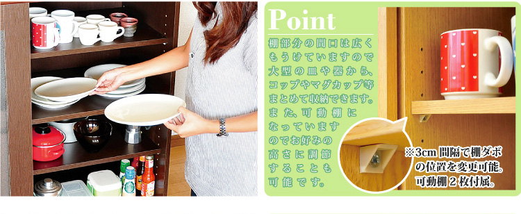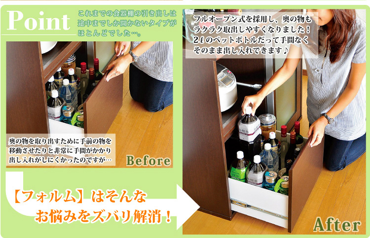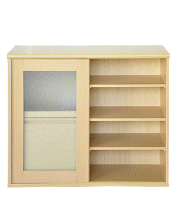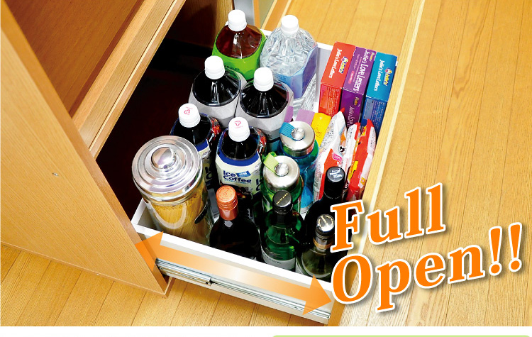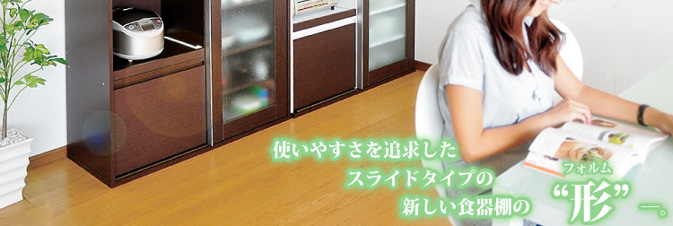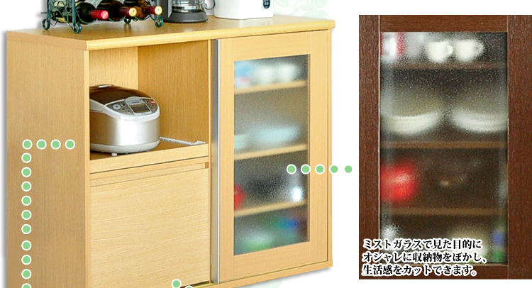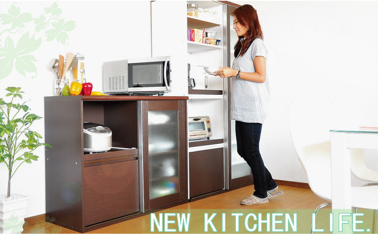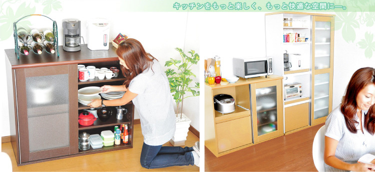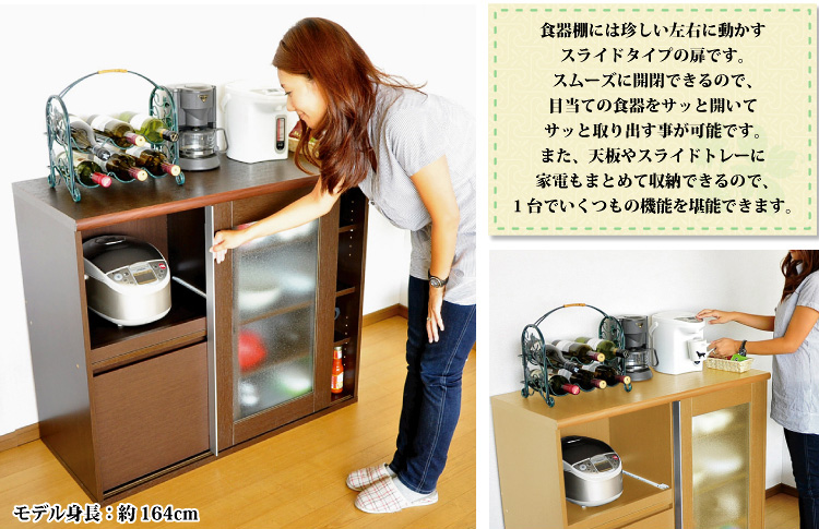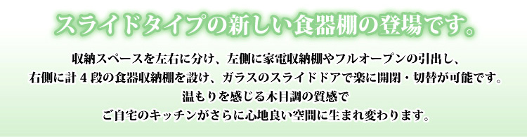 左側に家電収納棚やフルオープンの引き出し。右側に4段の食器収納棚を設け、ガラスのスライドドアで楽に開閉、切り替えができます。