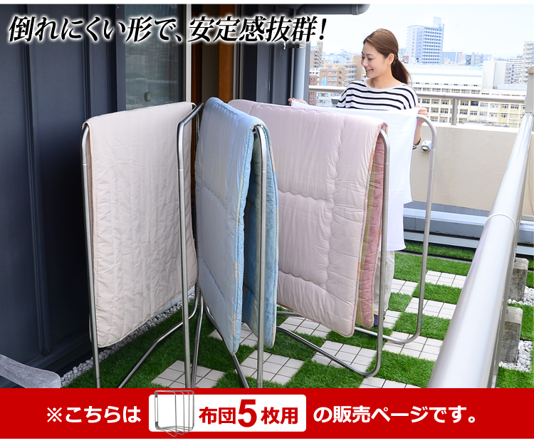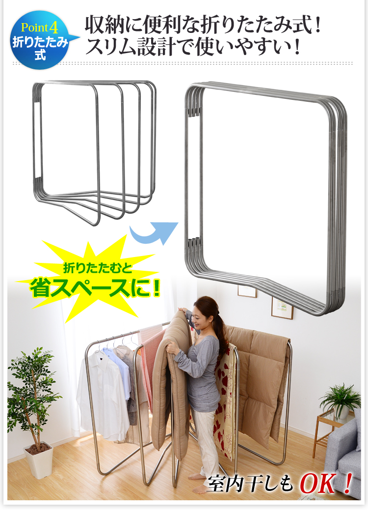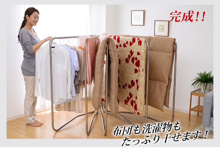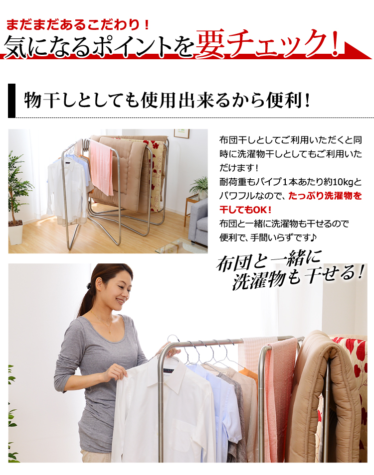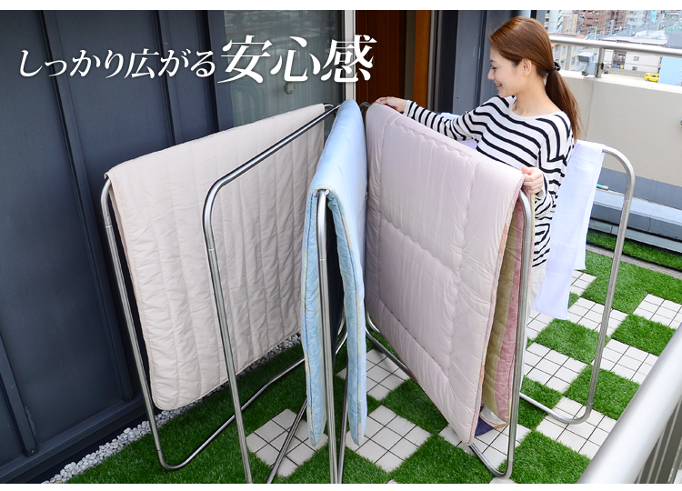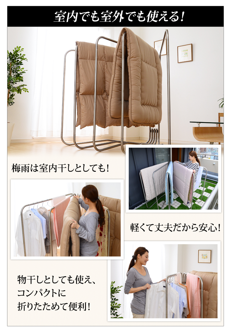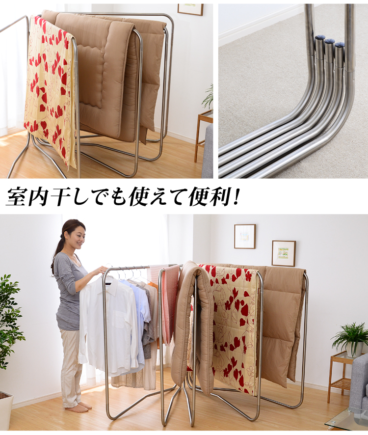 室内でも使えて、物干しとしても使用できる布団干し。錆びにくいステンレス製なので長くご愛用いただけます。