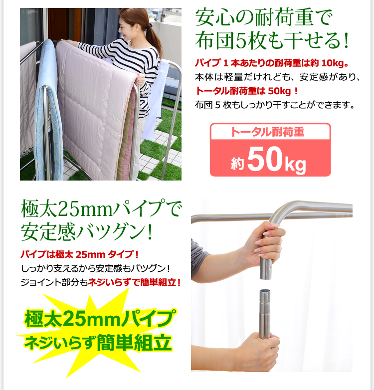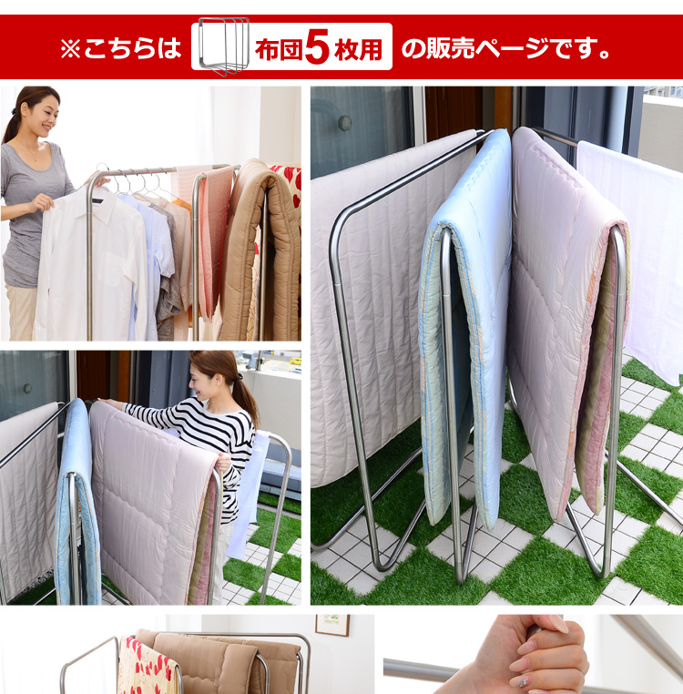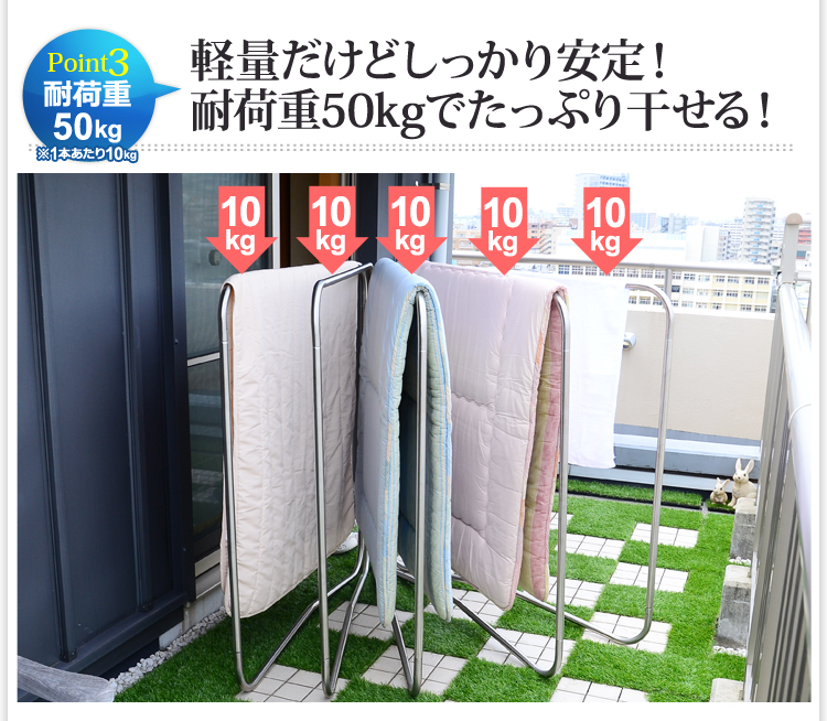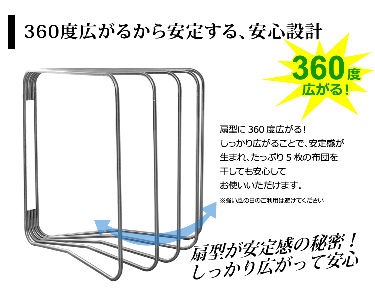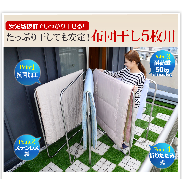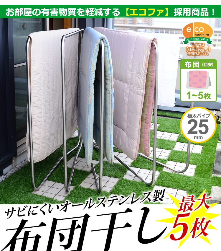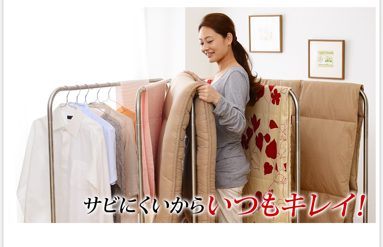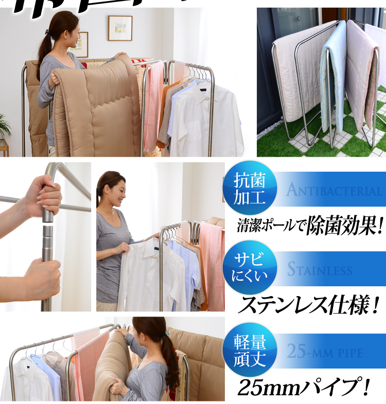 室内でも使えて、物干しとしても使用できる布団干し。錆びにくいステンレス製なので長くご愛用いただけます。