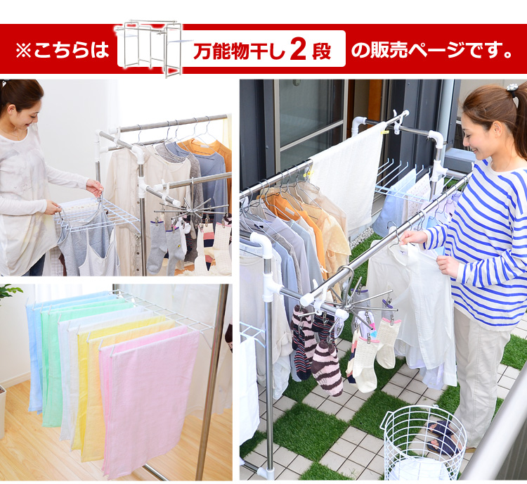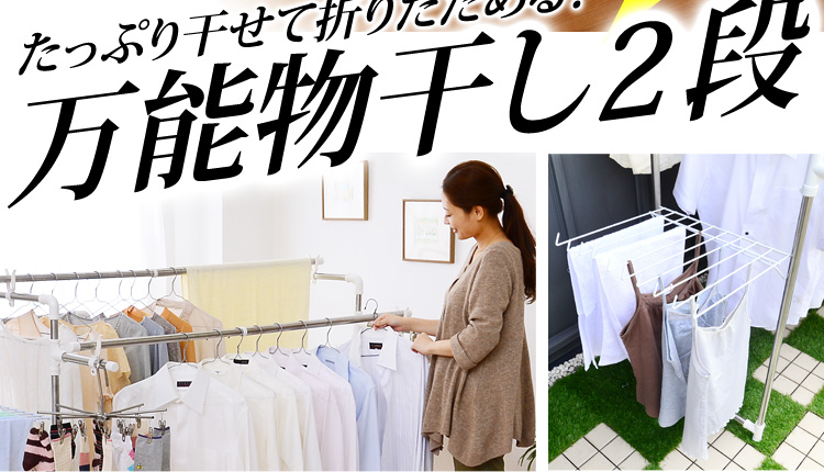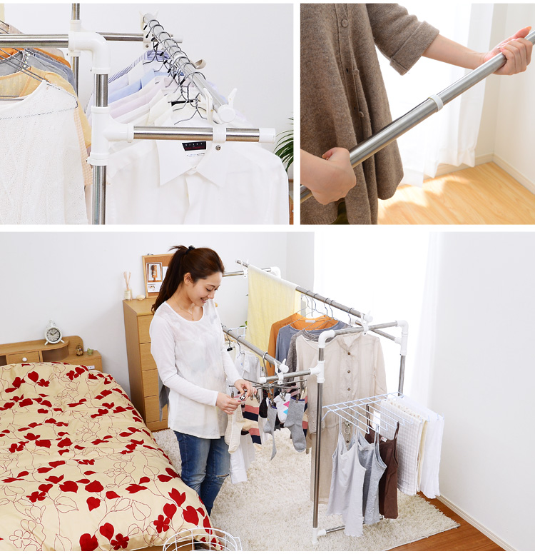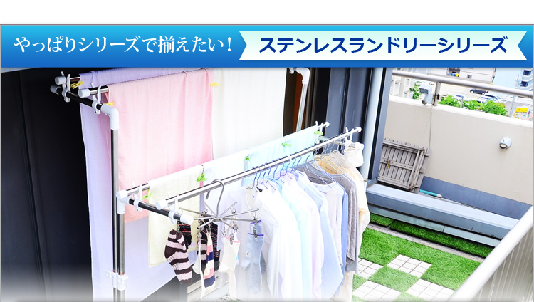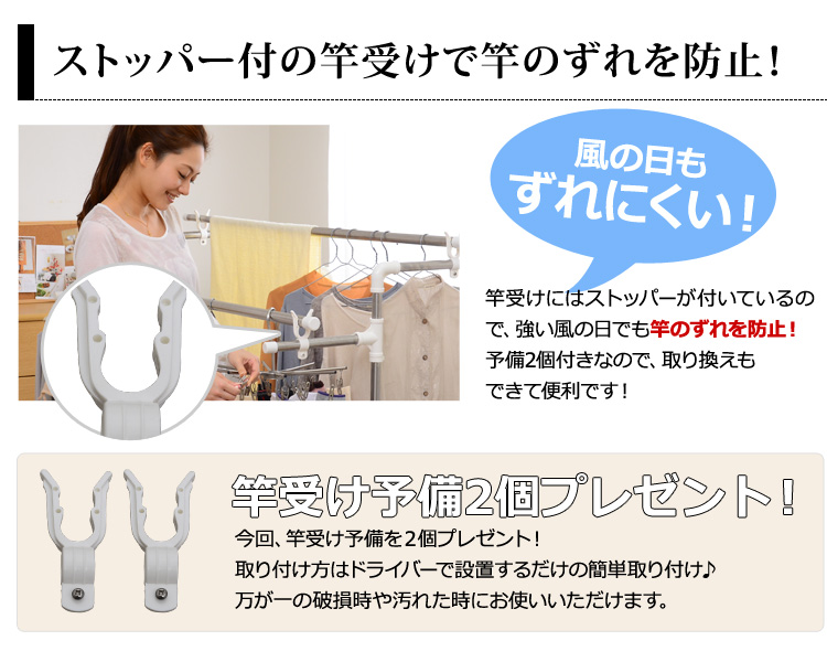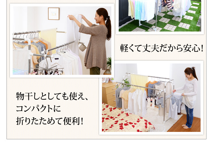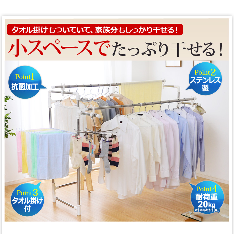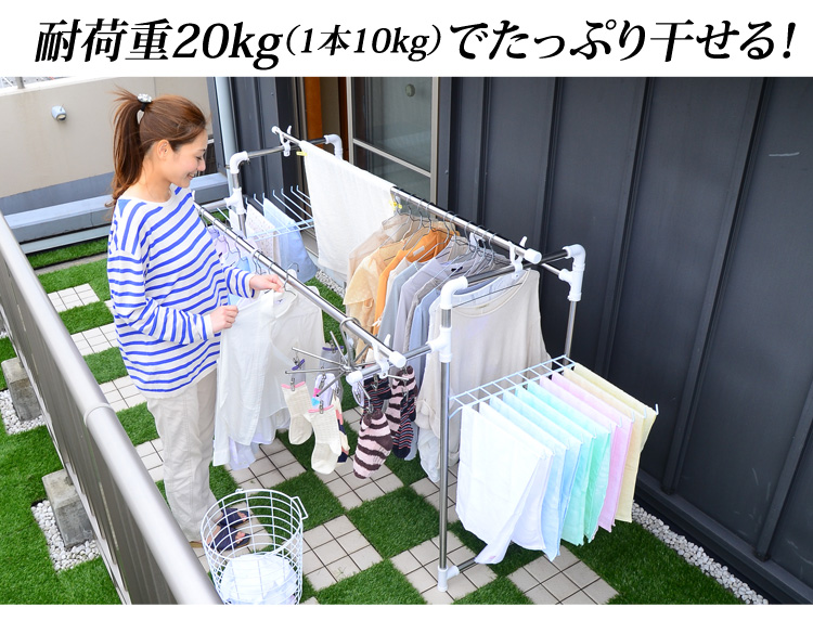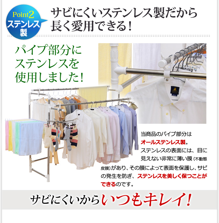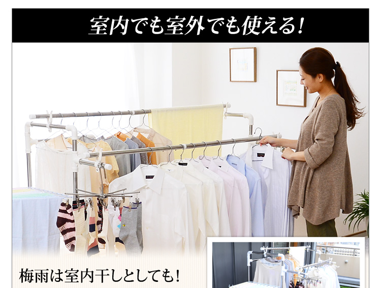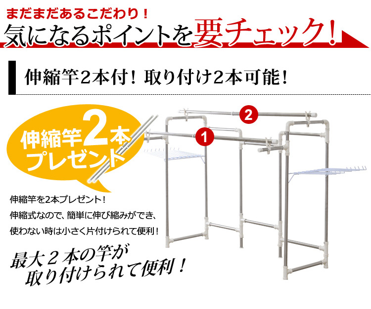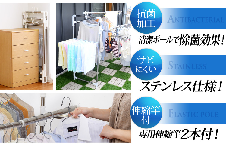 伸縮竿2本付きの物干し!省スペースでもたっぷり干す事ができます。錆びにくいステンレス製なので長くご愛用していただけます。
