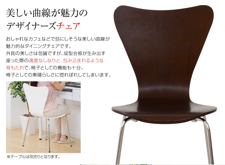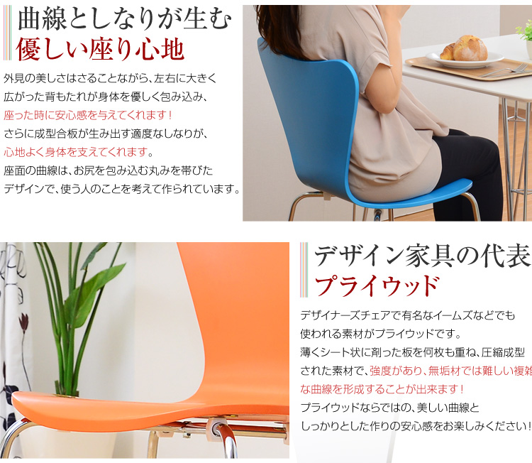 背面から背もたれにかけ、身体のラインに沿うように美しい3D曲線で構成されたデザイナーズチェアです。外見の美しさはもちろん、成型合板が生み出す座った際の椅子としての機能も十分です。