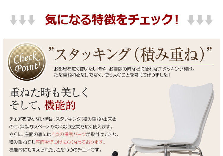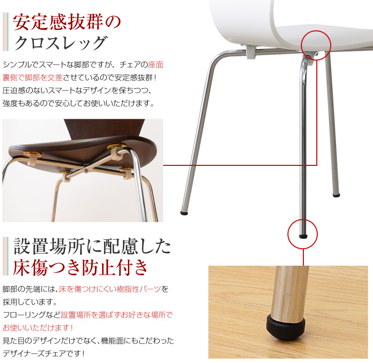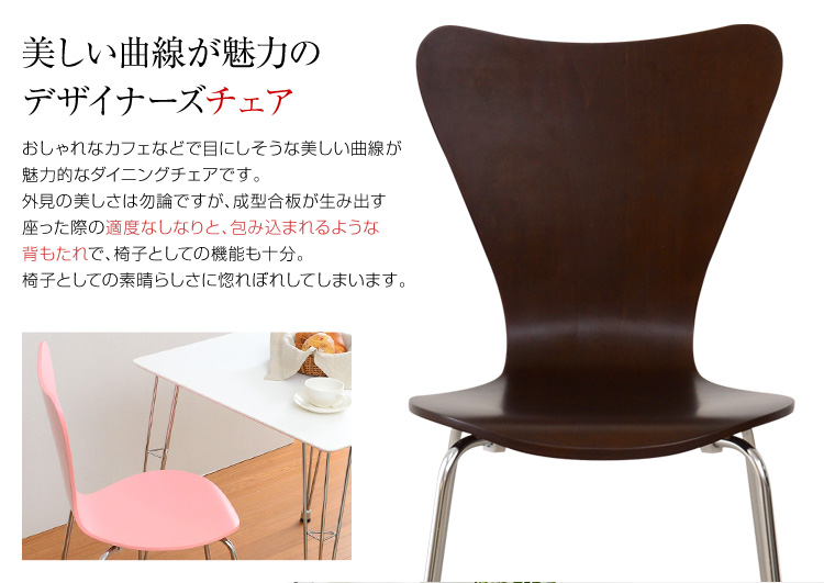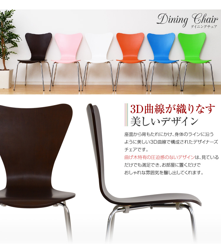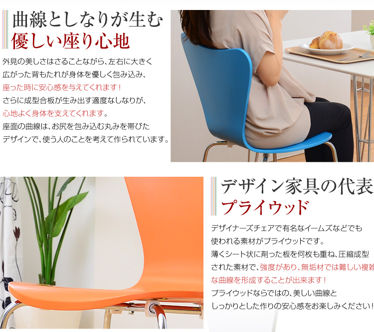 左右に大きく広がった背もたれが身体を優しく包み込み、座ったときに安心感を与えてくれます。また、成型合板が生み出す適度なしなりが心地よく身体を支えてくれます。