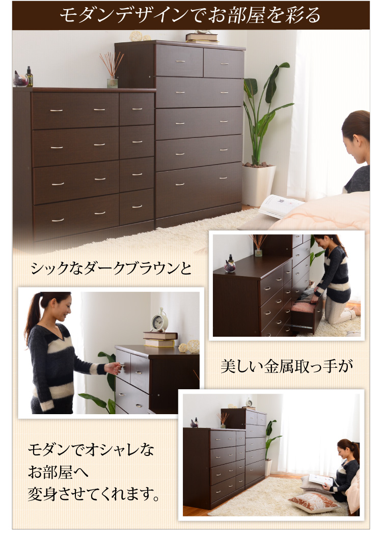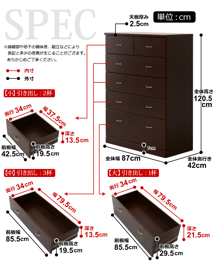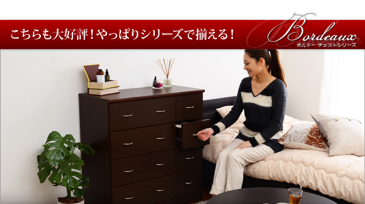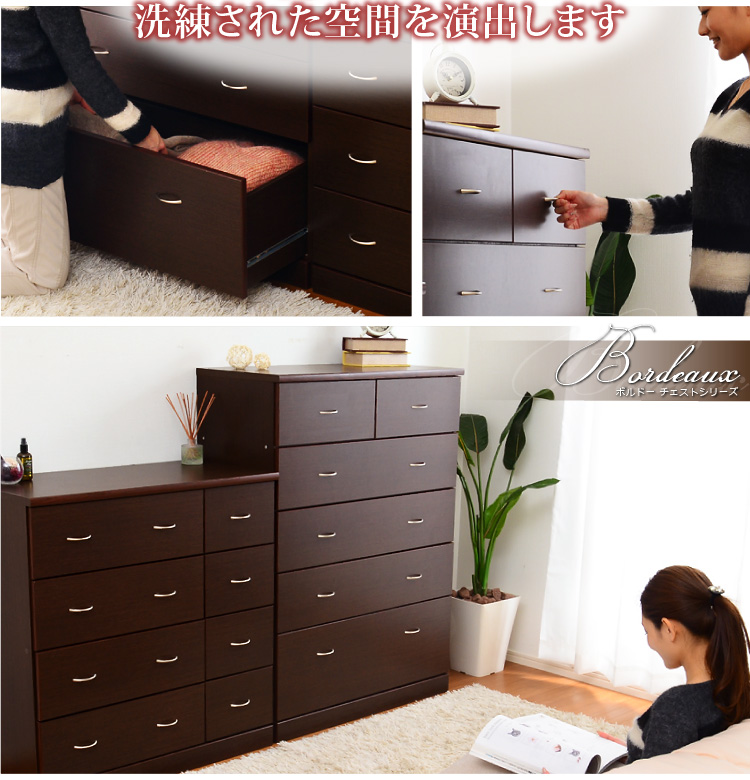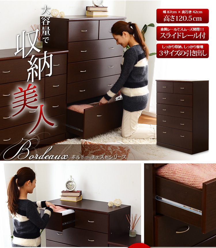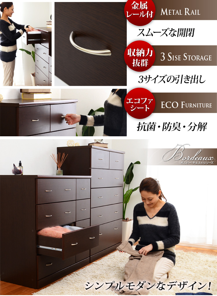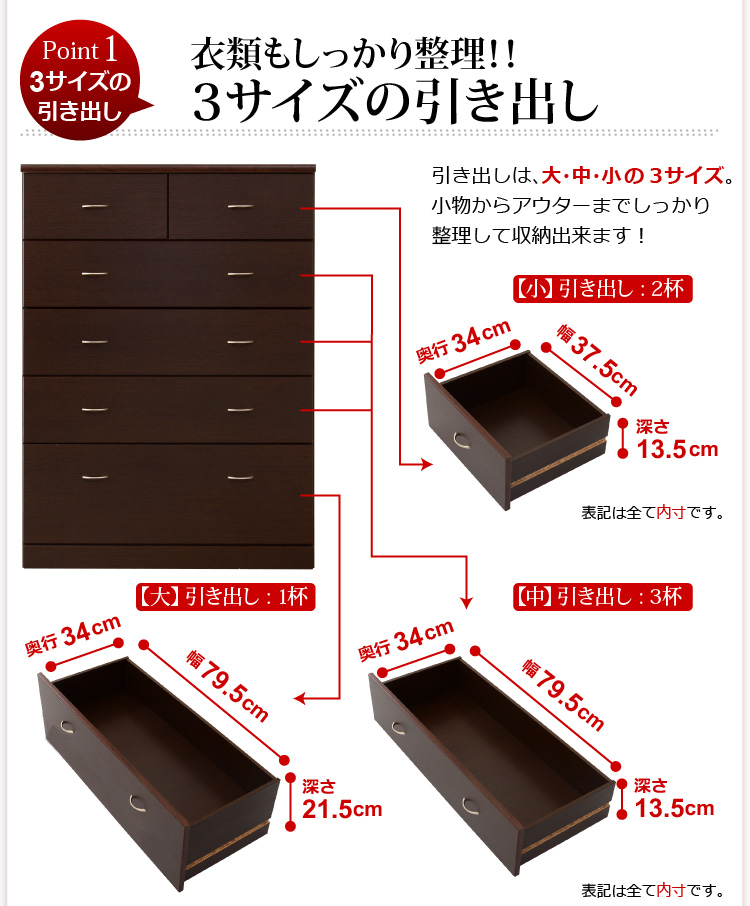引き出しは大、中、小の3サイズ。小物からアウターまでしっかり整理して収納できます。