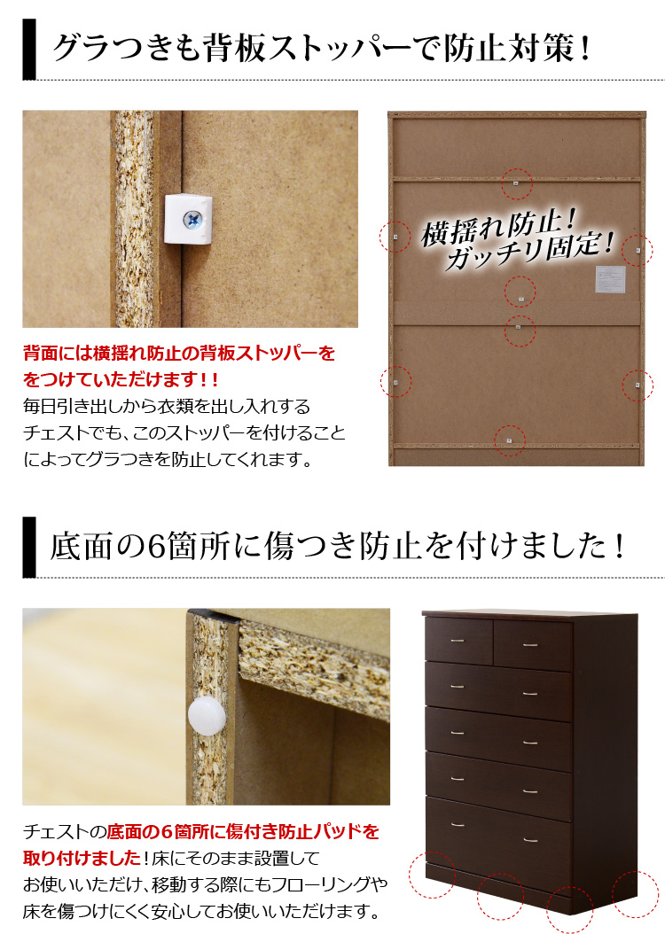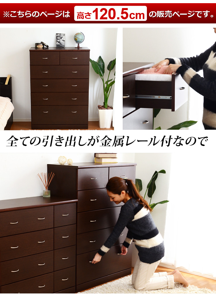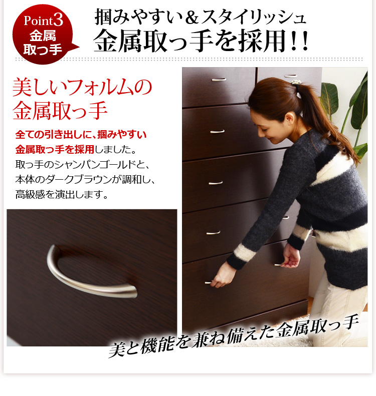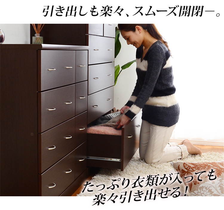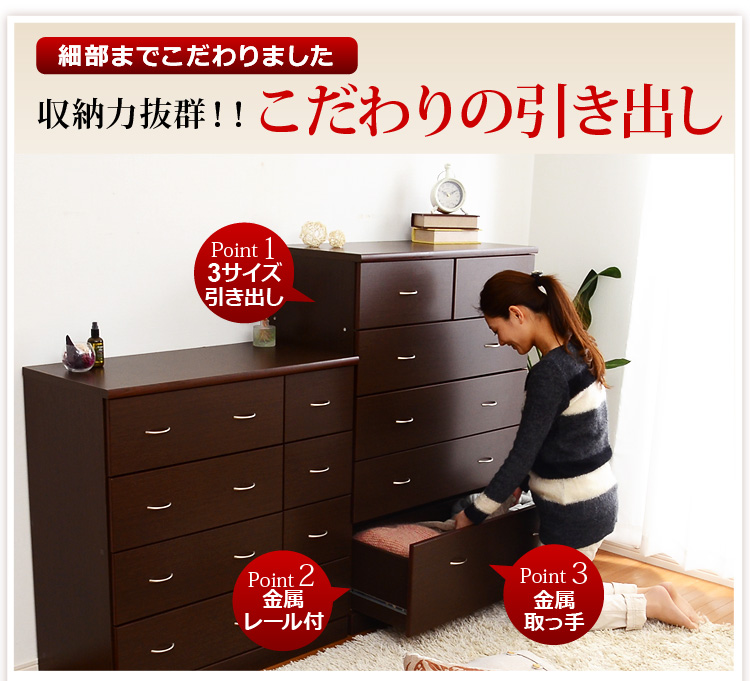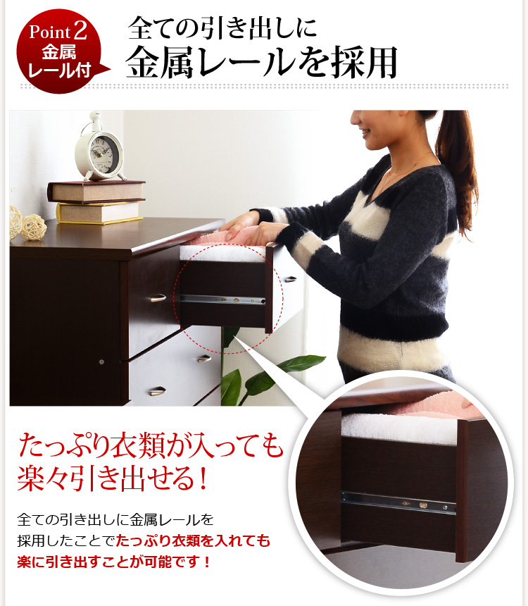 全ての引き出しに金属レールを使用しています。たっぷり収納しても楽に引き出す事ができます。