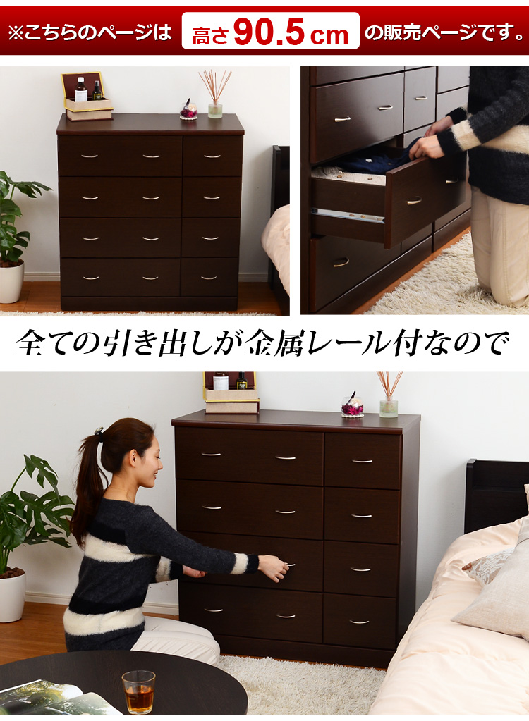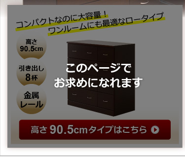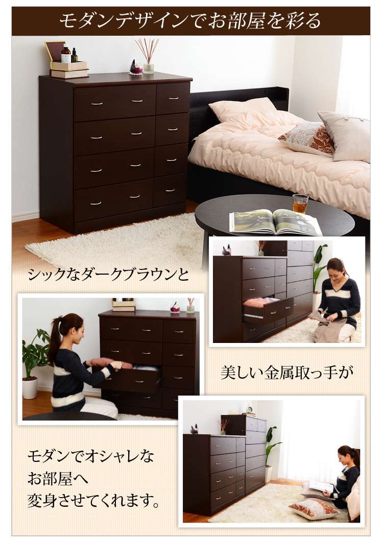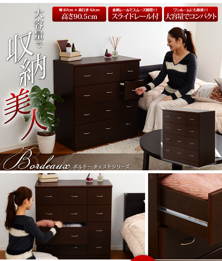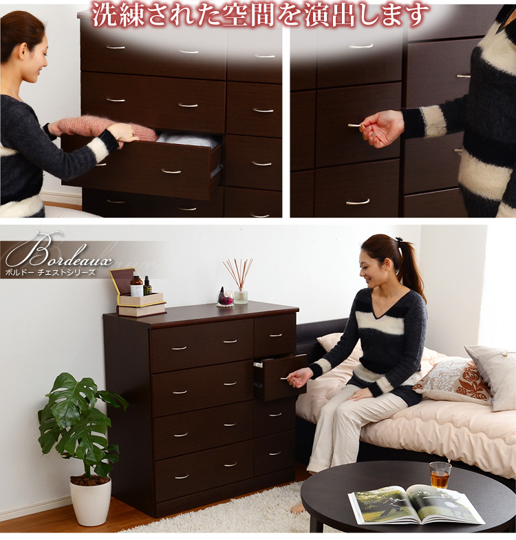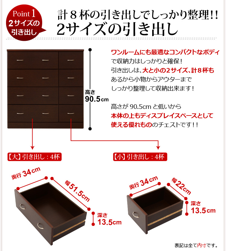 ワンルームにも最適なコンパクトサイズでも、大と小、計8杯の引き出しで小物からアウターまでしっかり整理して収納できます。