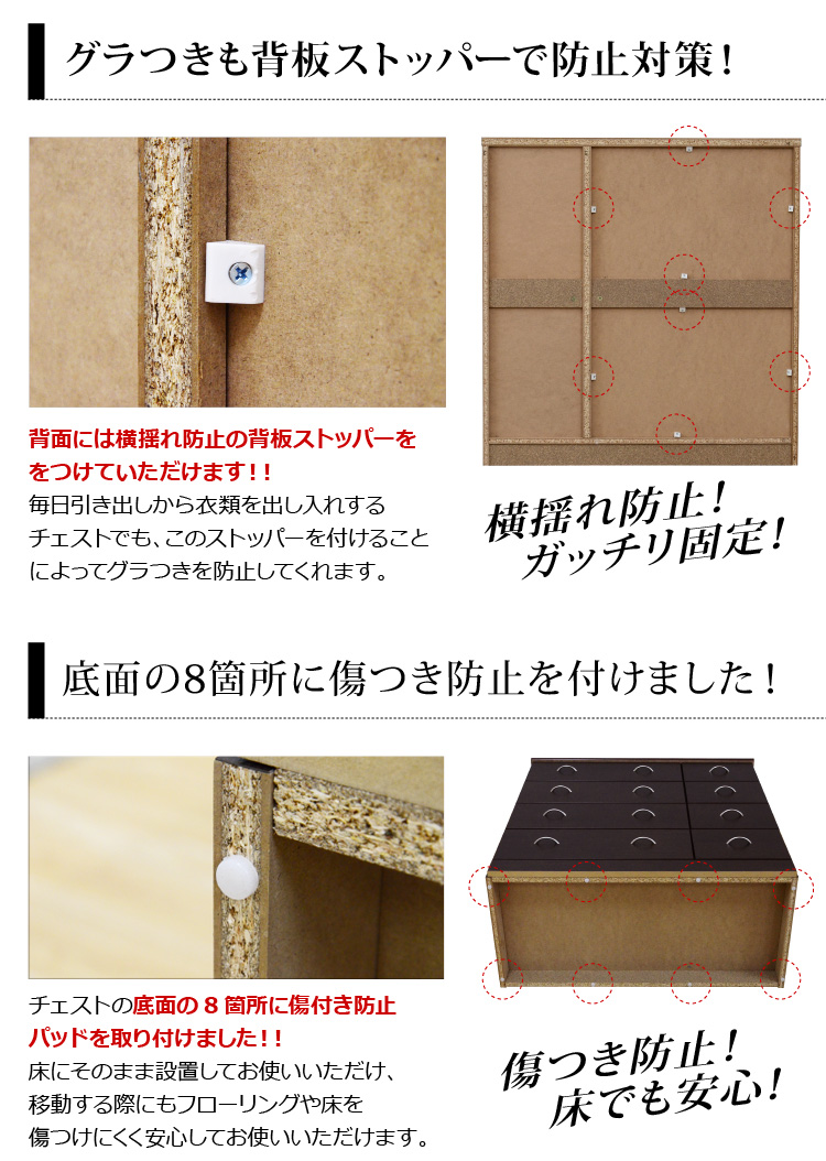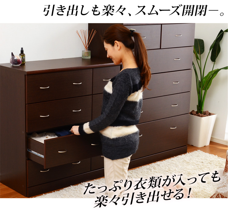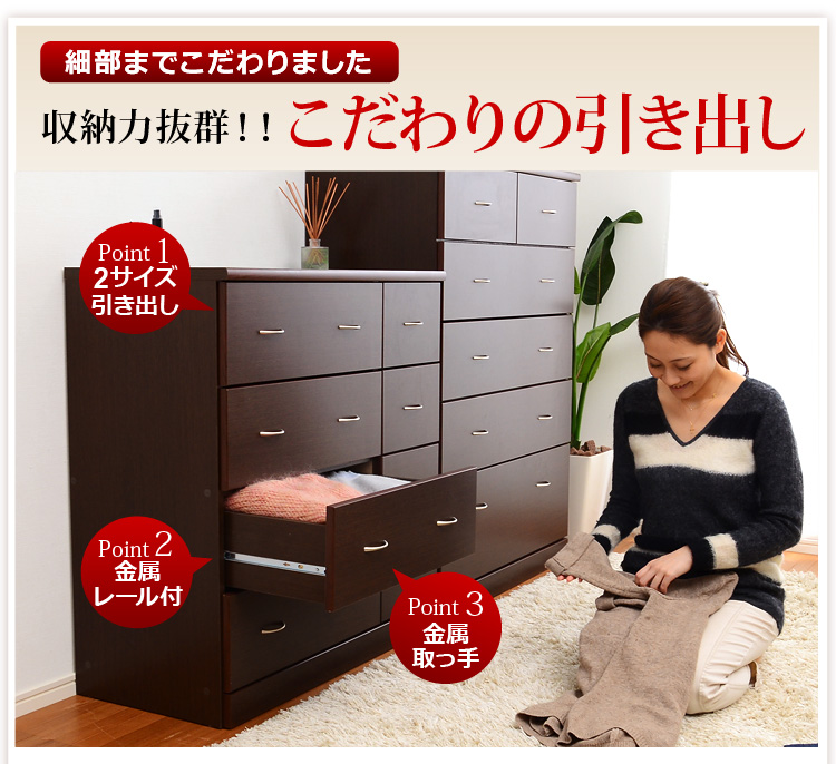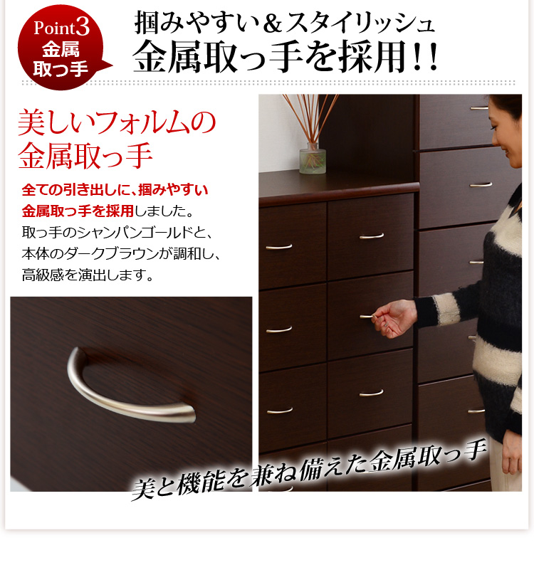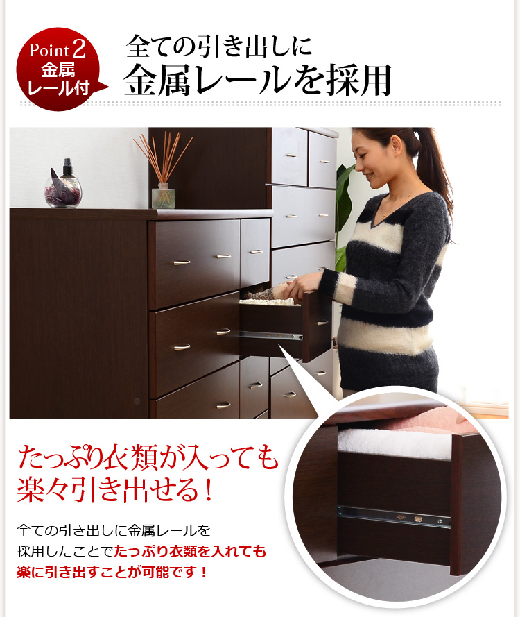 全ての引き出しに金属レールを使用しています。たっぷり収納しても楽に引き出す事ができます。