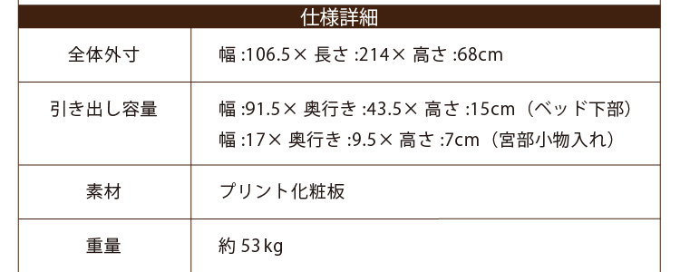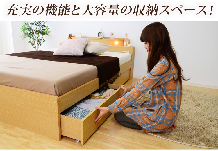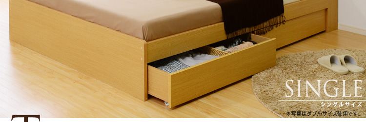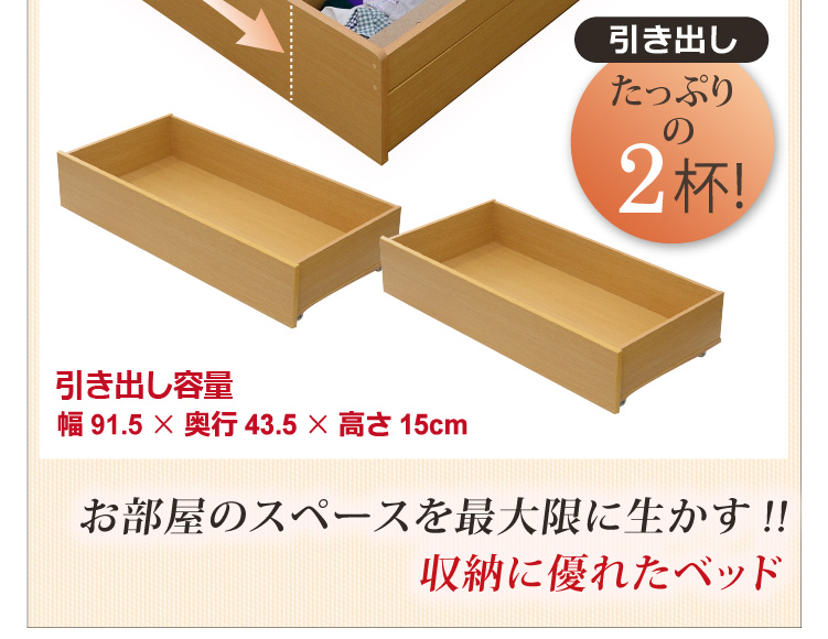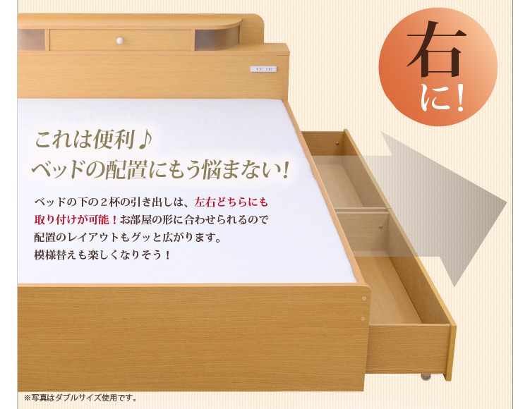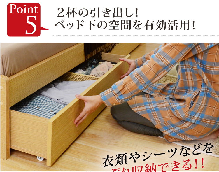 ベッドの下に引き出し収納が付いています。衣類やシーツなどたっぷり収納できます。引き出しは左右どちらにも取り付けることができるので、お部屋のレイアウトに合わせられます。