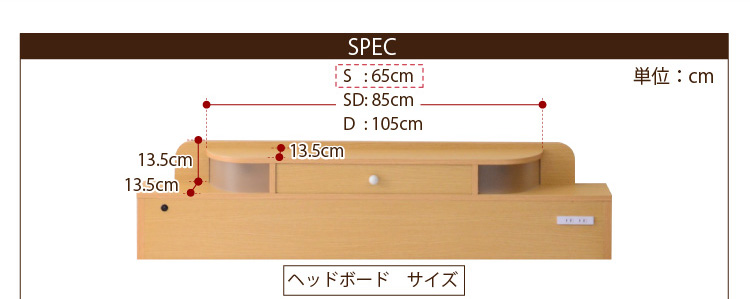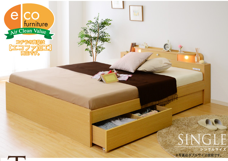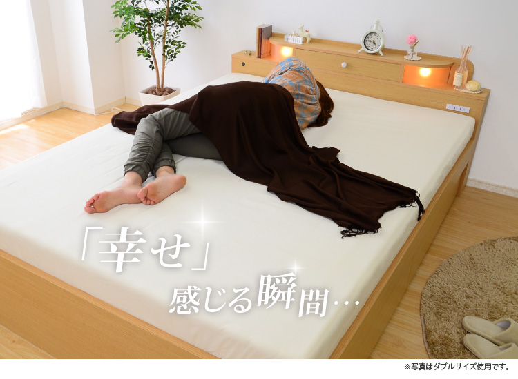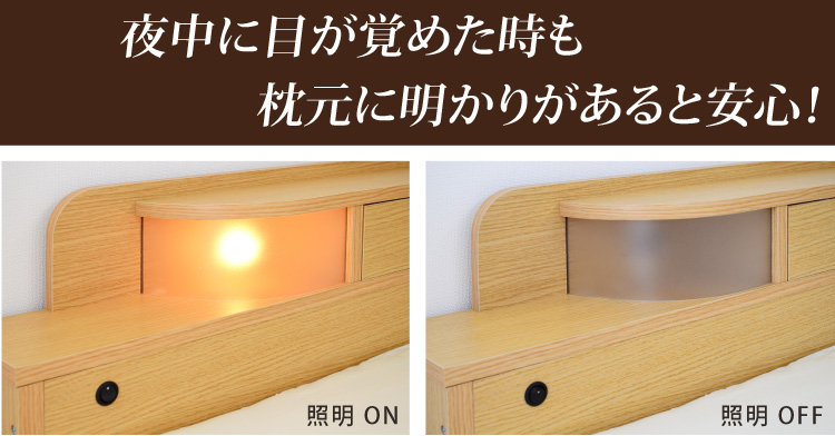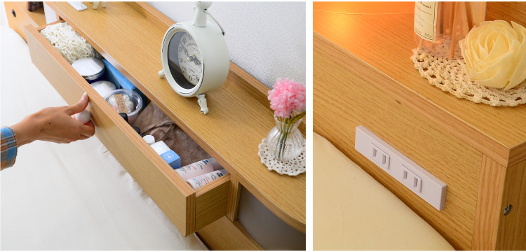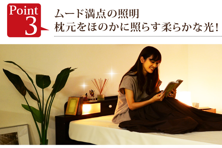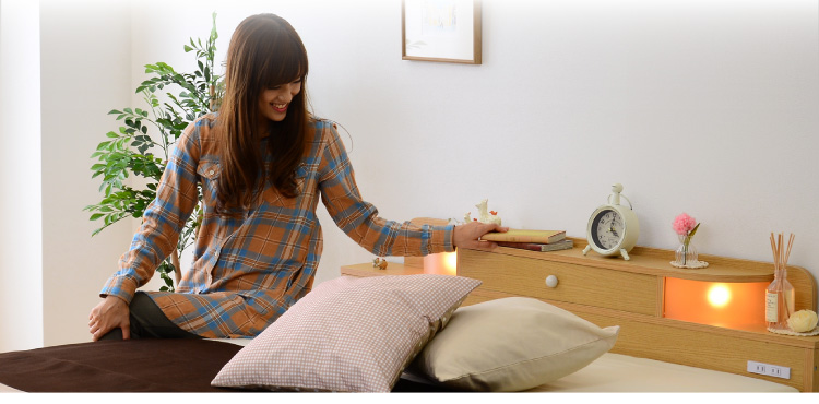 散らかる小物を収納するのに便利な小物入れと、その左右には間接照明も付いてます。ムードのある光はベッド周りを雰囲気ある空間に演出してくれます。