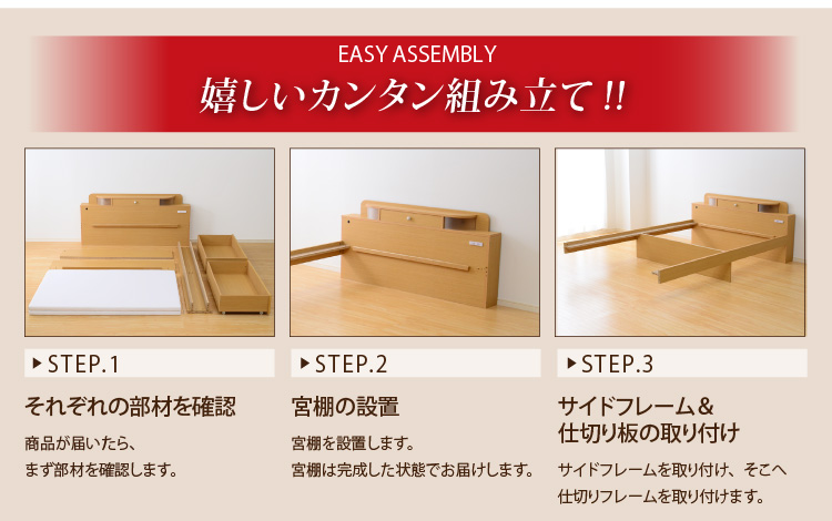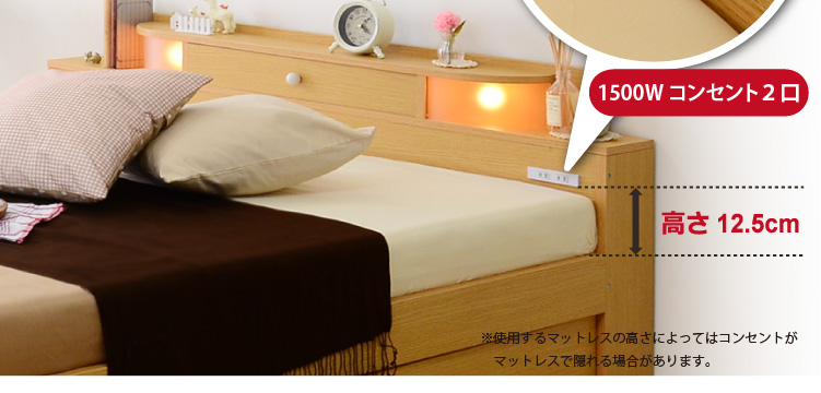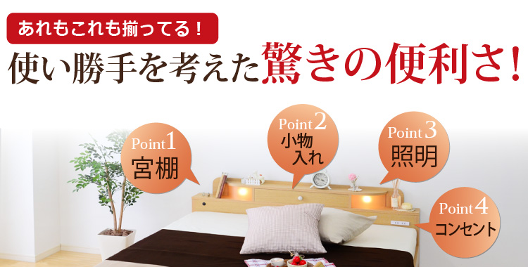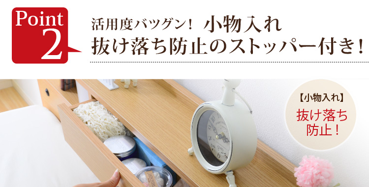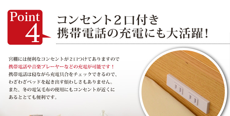 必要な小物をいつも枕元に置ける宮棚が付いてます。コンセントも付いているので、電気毛布や携帯、スマホの充電などに便利!