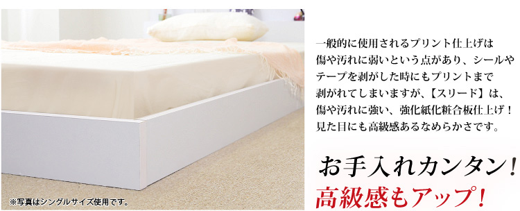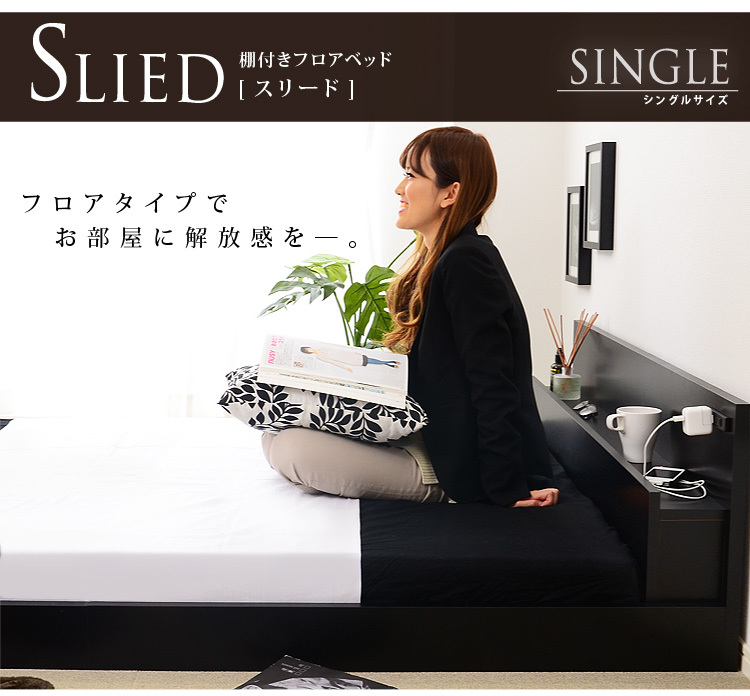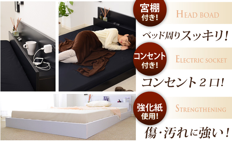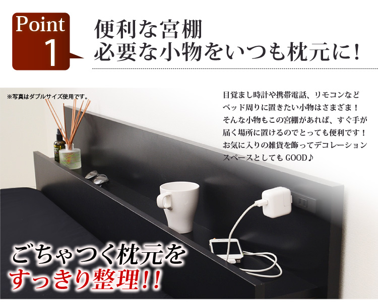 必要な小物をいつも枕元に置ける宮棚が付いてます。コンセントも付いているので、電気毛布や携帯、スマホの充電などに便利!