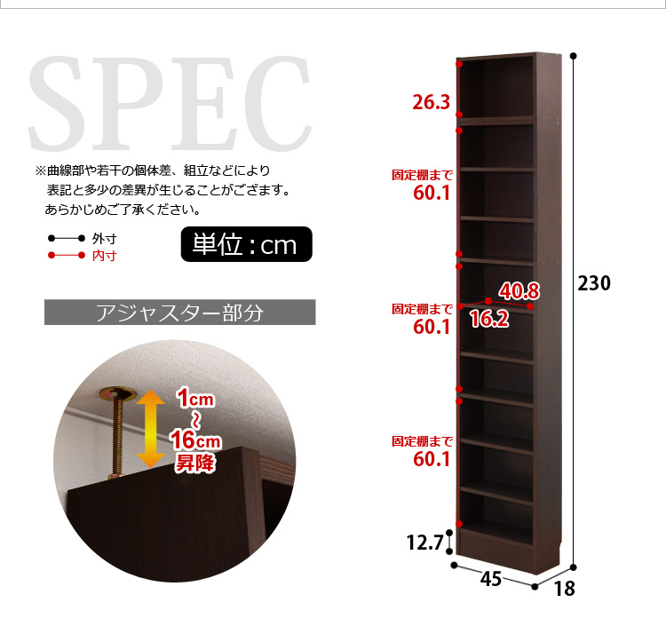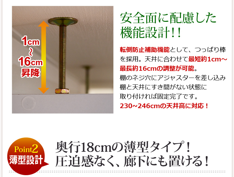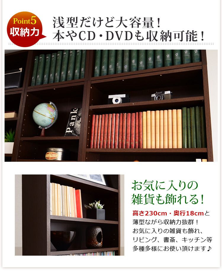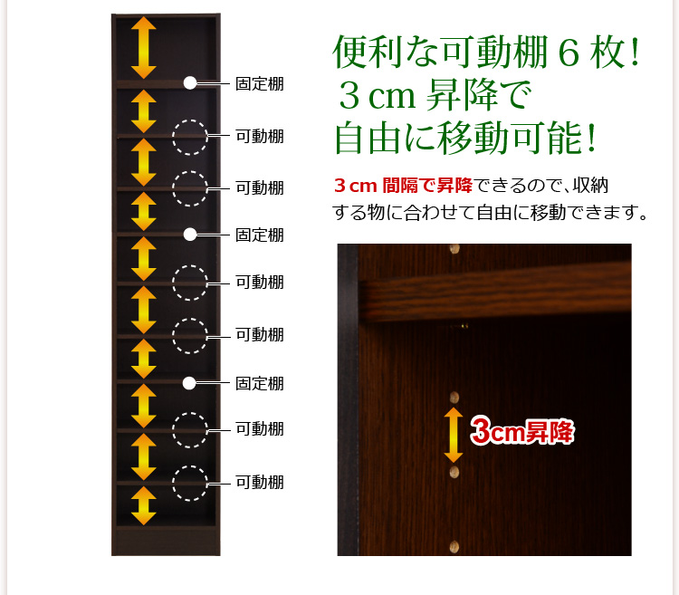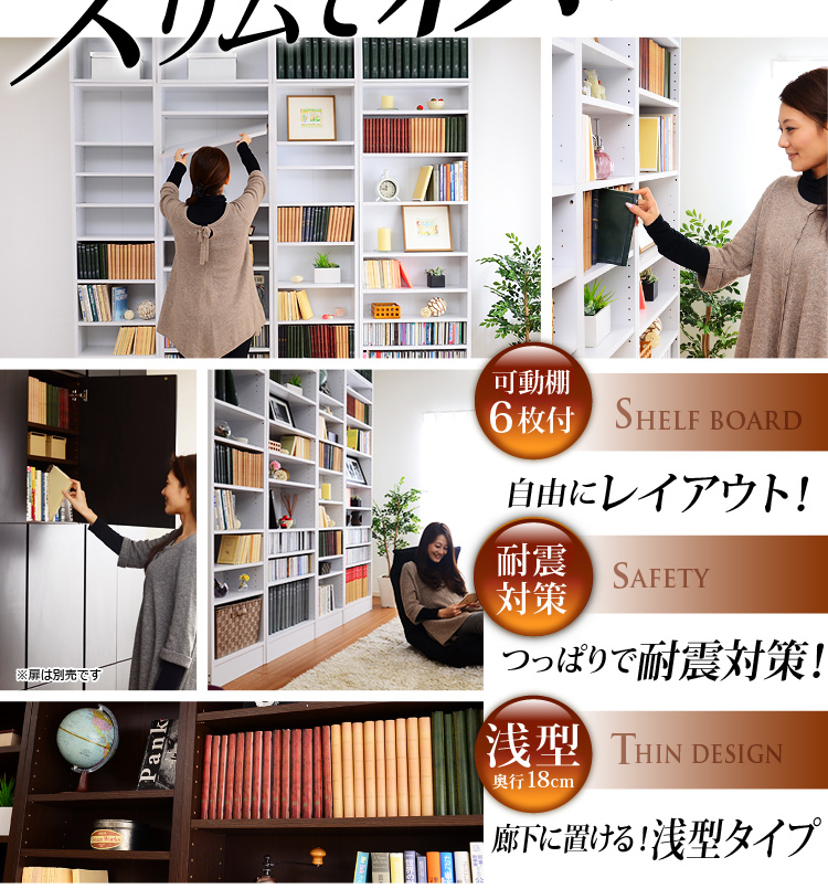 薄型ながら収納力は抜群!可動棚も付いているので、収納するものを選ばず、多種多様にお使いいただけます。