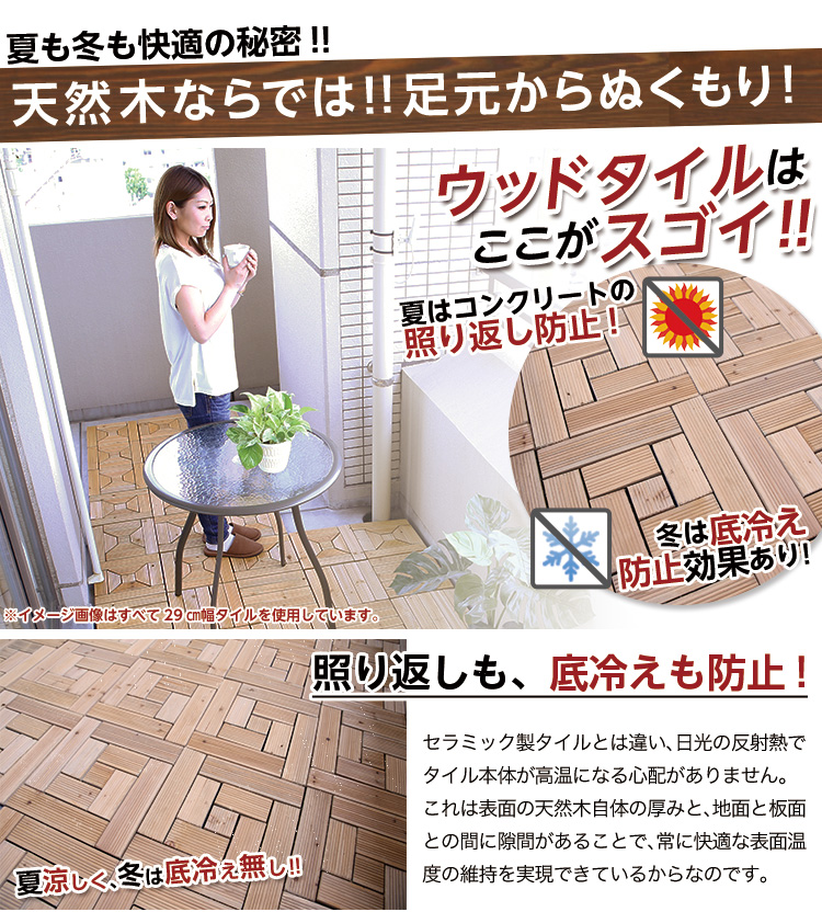 こちらのウッドタイルは、夏は照り返し防止、冬は底冷え防止効果があるので天然木ならではの足元からのぬくもりを感じられます。裏は水に強いプラスチックなので、長時間の使用にも耐えられる仕様になっております。