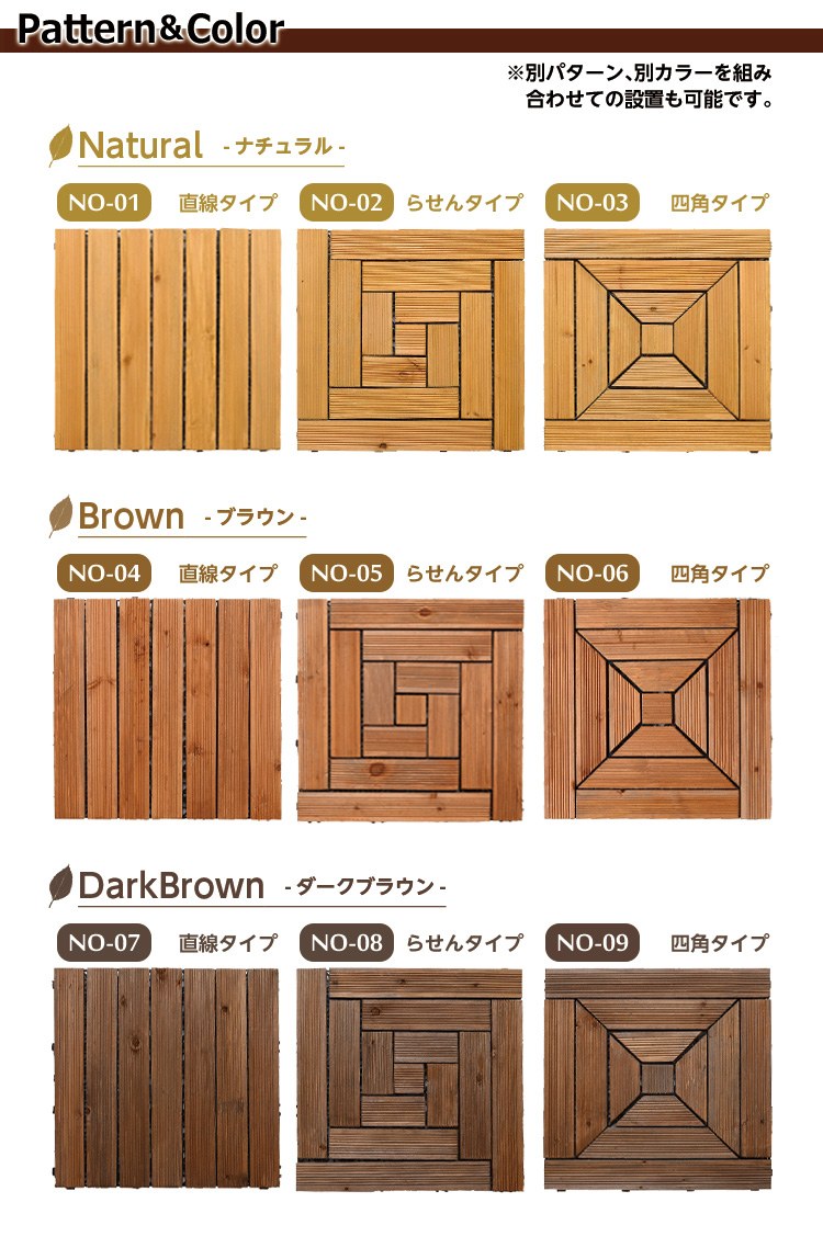 色も柄もサイズもお好みで!パターン、色、幅の計18タイプをお選びいただけます。理想のウッドデッキがベランダで実現できます!