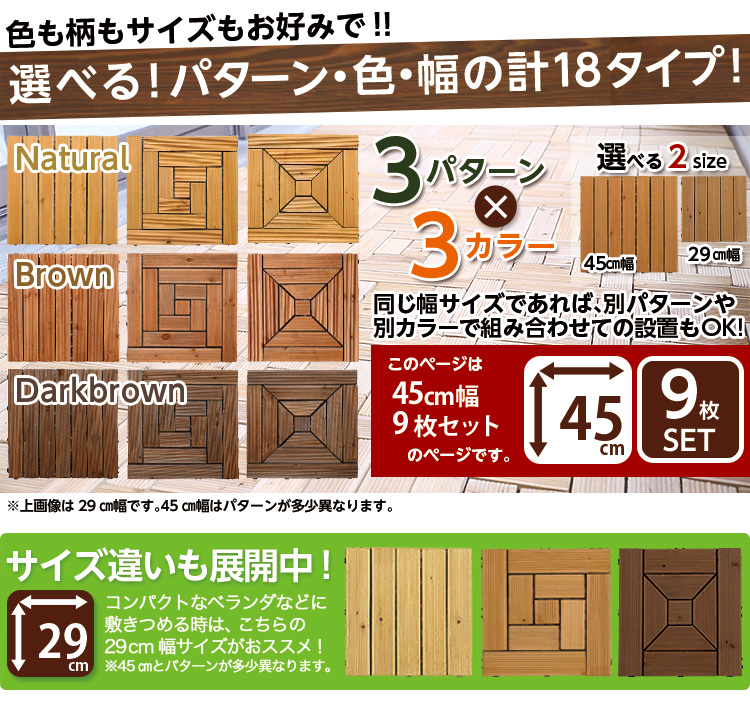 色も柄もサイズもお好みで!パターン、色、幅の計18タイプをお選びいただけます。理想のウッドデッキがベランダで実現できます!