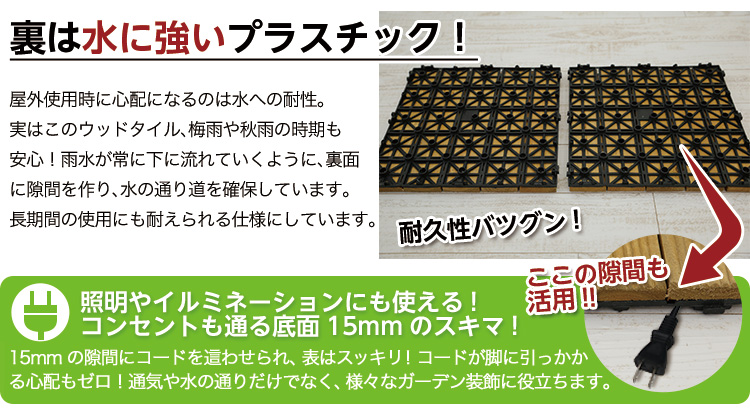 こちらのウッドタイルは、夏は照り返し防止、冬は底冷え防止効果があるので天然木ならではの足元からのぬくもりを感じられます。裏は水に強いプラスチックなので、長時間の使用にも耐えられる仕様になっております。
